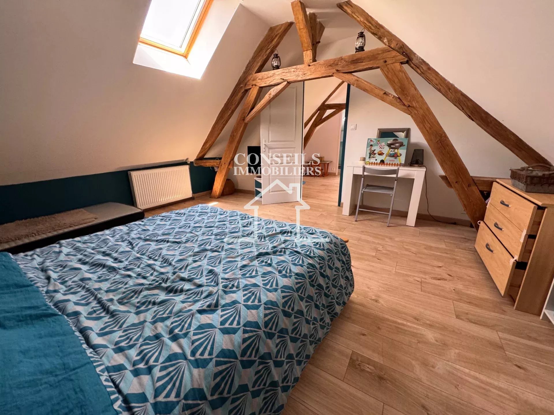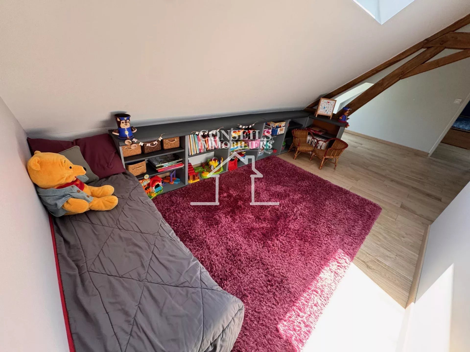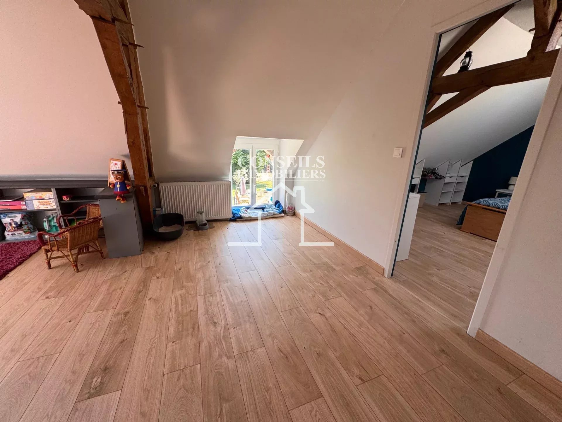 À l'étage, l'ambiance se prolonge avec un palier accueillant aménagé en salon, une salle d'eau avec WC, et deux chambres spacieuses baignées de lumière.