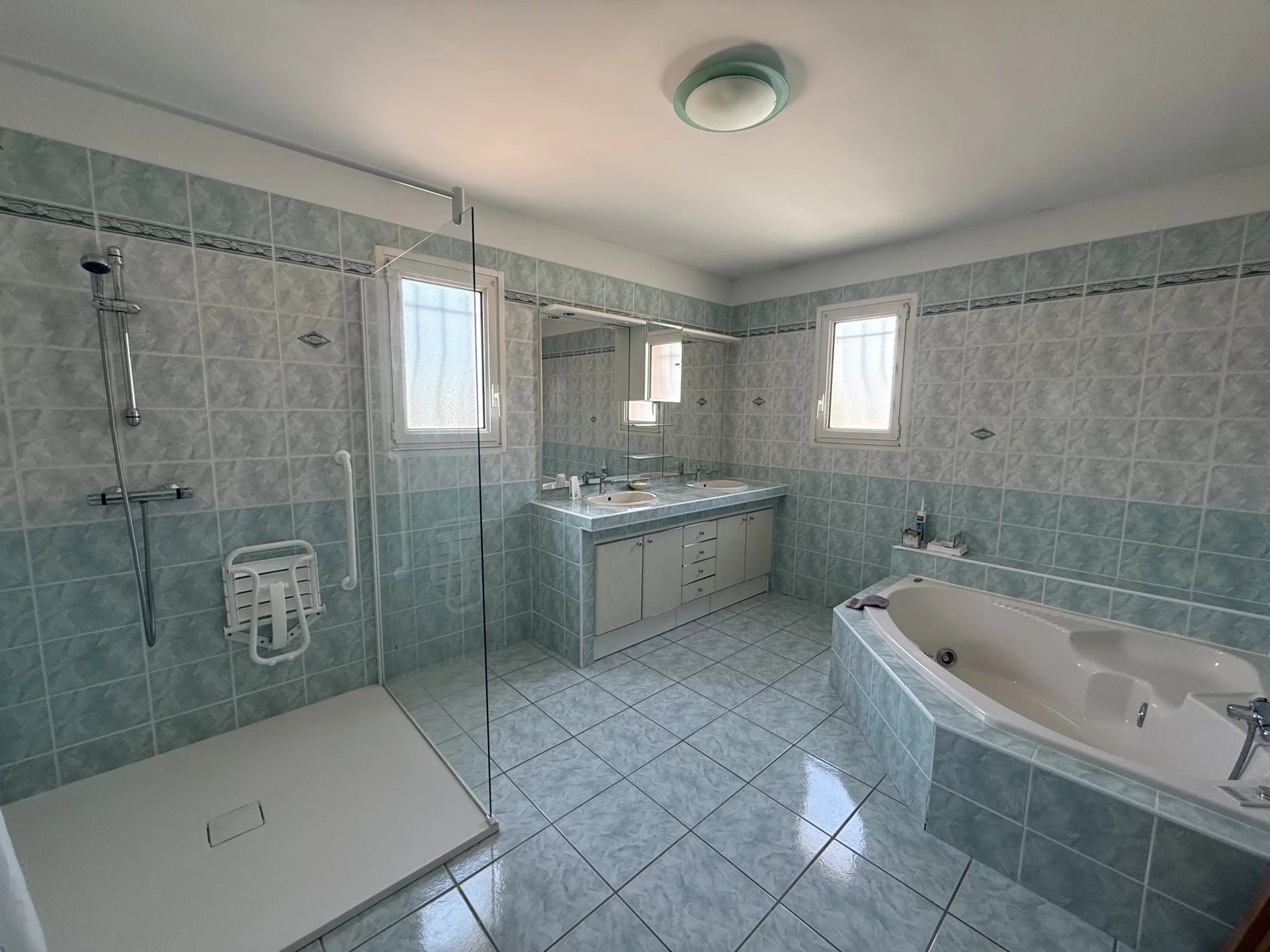 Elle offre un vaste espace de vie de 45 m² avec cuisine équipée indépendante, 4 belles chambres avec clim, 1 salle d'eau, 1 salle de bain complète avec douche et baignoire, 2 wc et une grande buanderie.