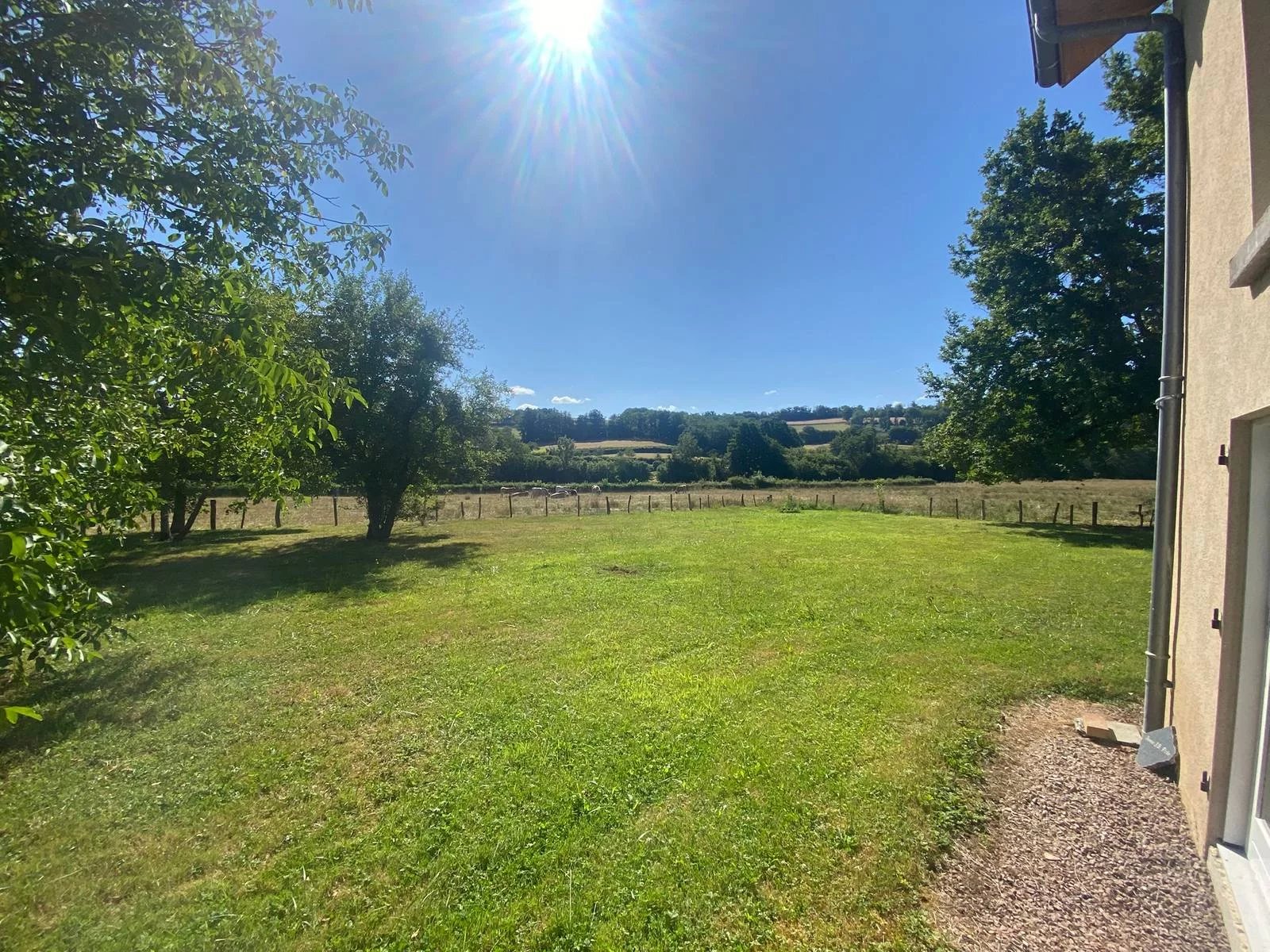 L'ensemble sur un terrain d'environ 2100 m2, plat et arboré, sans vis-à-vis et avec une vue dégagée sur la campagne environnante.