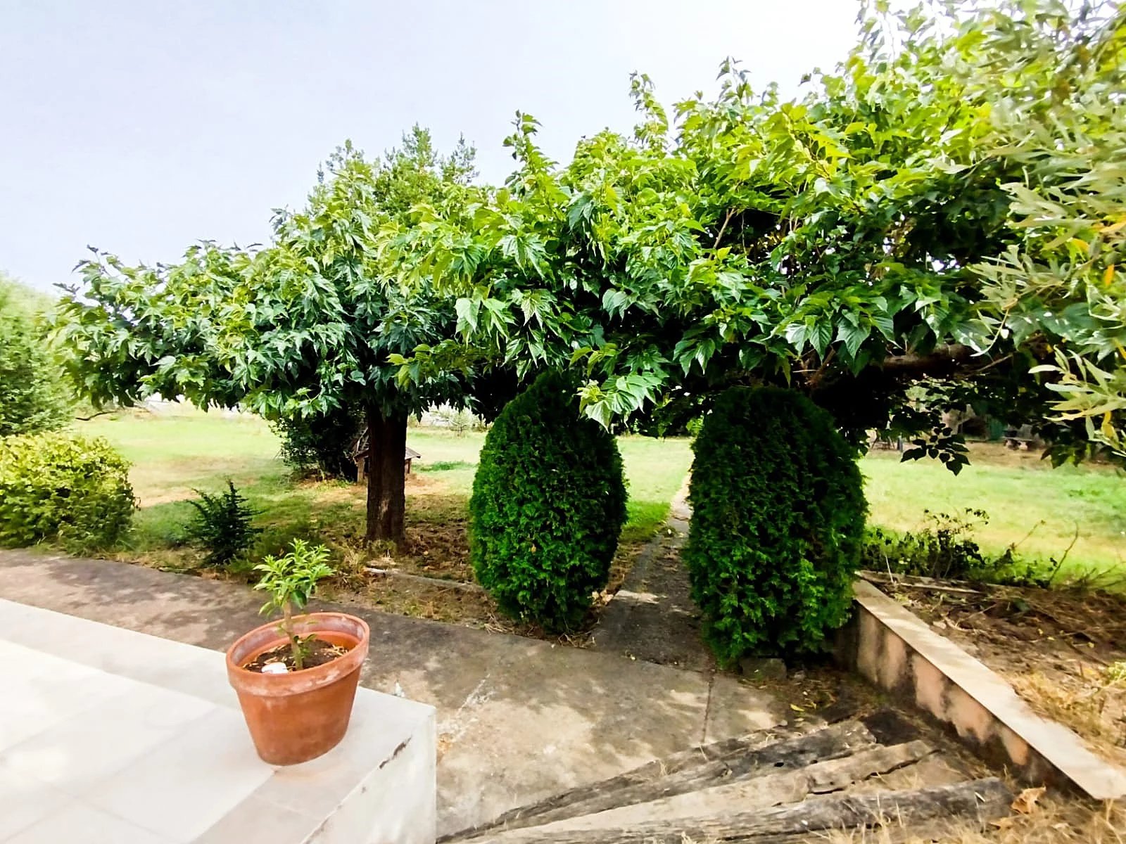 Le terrain et plat, arboré il offre une multitude d'espaces à vivre : arbres fruitiers, coins détente, terrasses baignées de lumière...