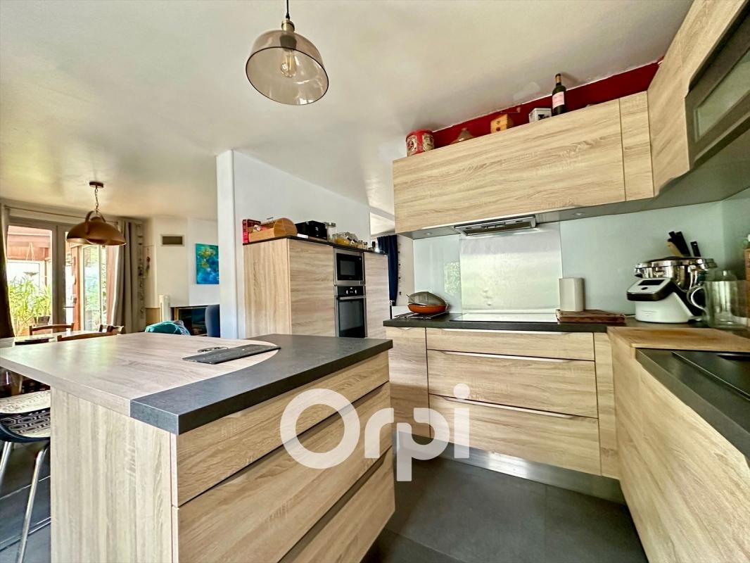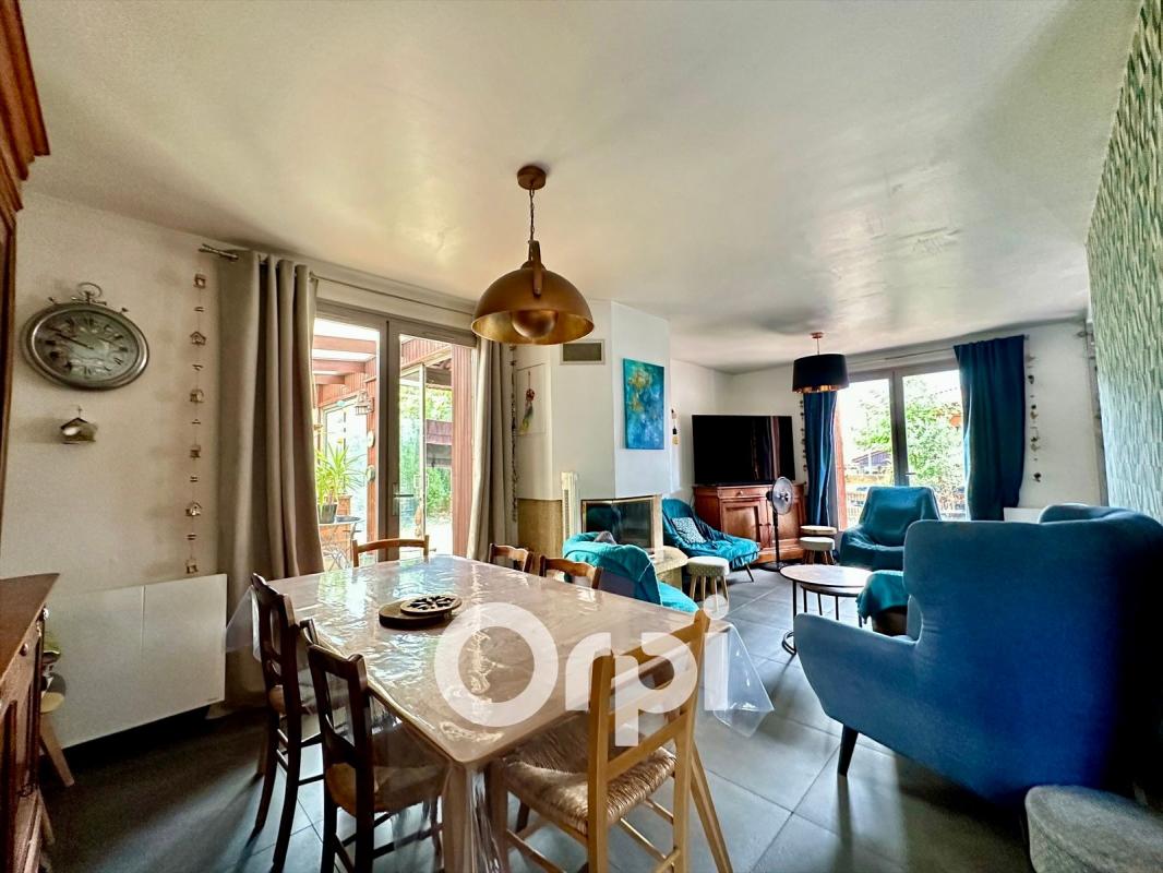 Prolongée par une véranda lumineuse, la pièce de vie s'ouvre sur un jardin intimiste, parfait pour les jeux d'enfants, les repas en plein air ou simplement se détendre au calme.