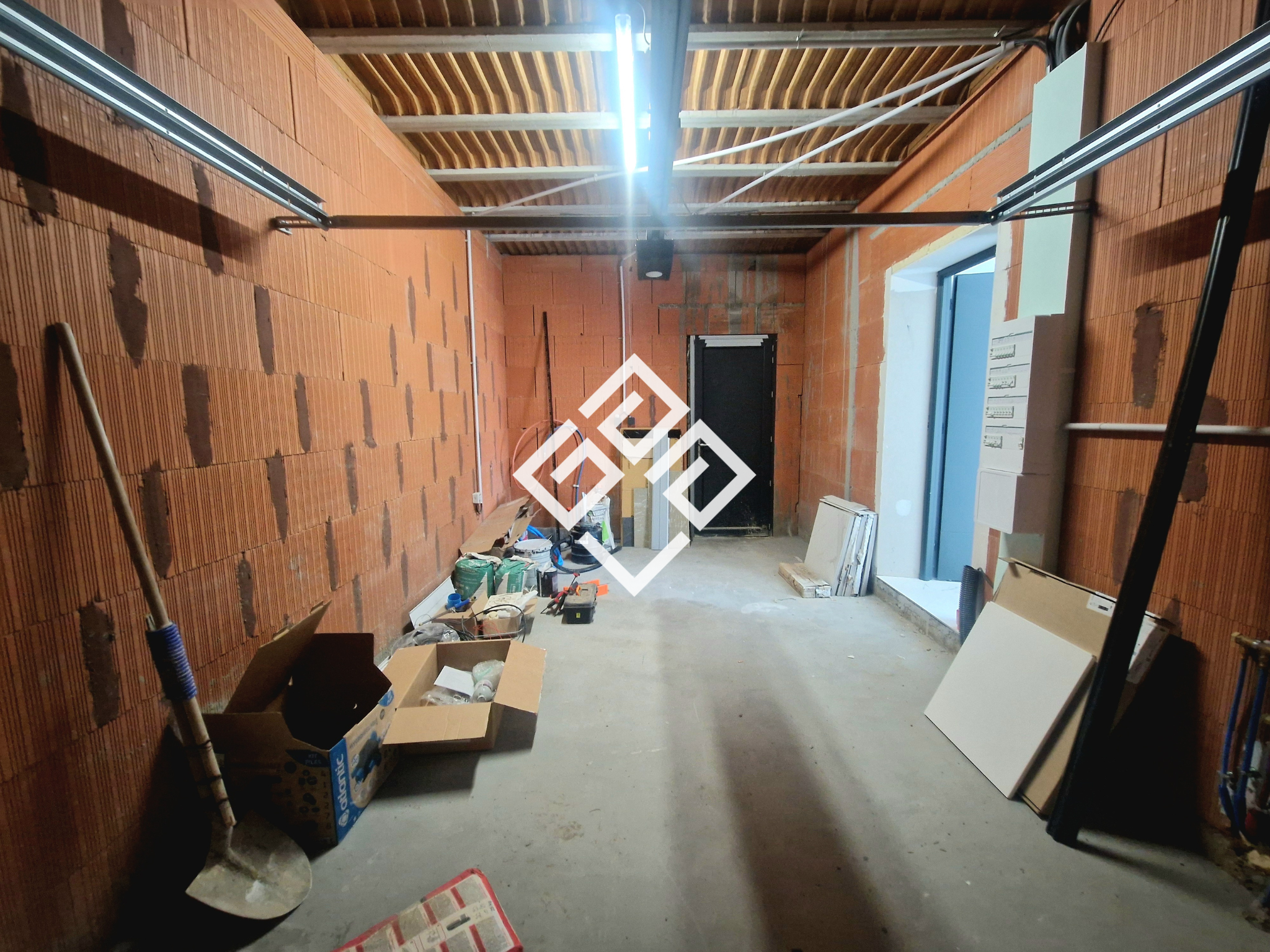 Un garage carrelé de 18 m2, fonctionnel et pratique, peut accueillir un véhicule ou être utilisé comme espace de rangement supplémentaire.