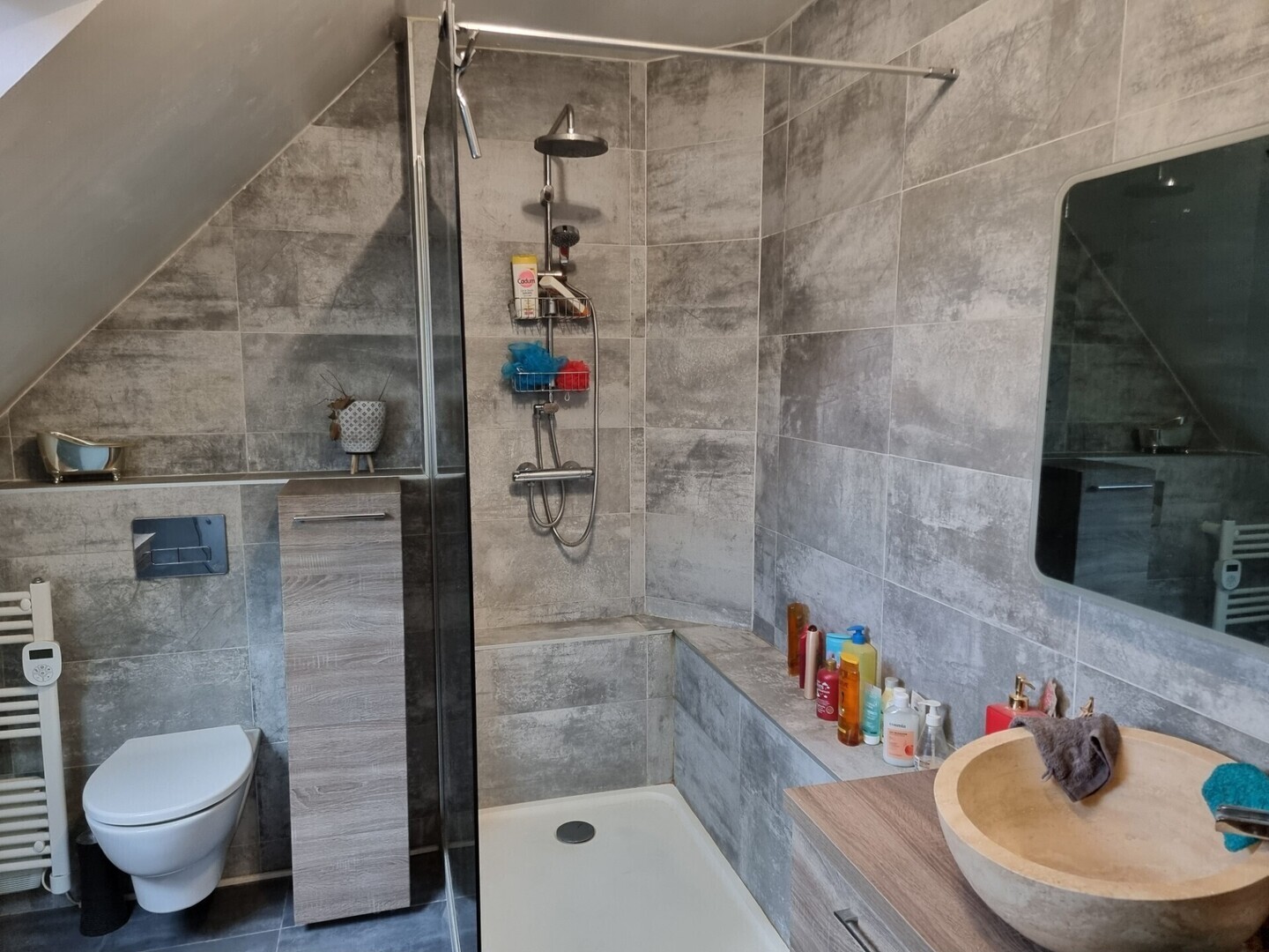 1 salle d'eau récente (douche à l'italienne, vasques, wc).