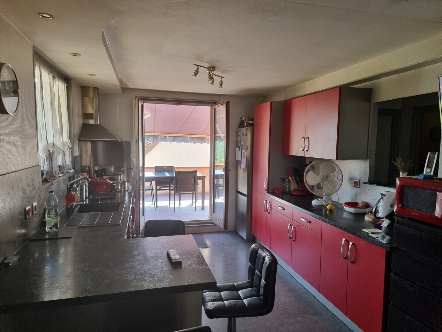 1 cuisine aménagée ouverte sur le coin repas avec accès à une terrasse