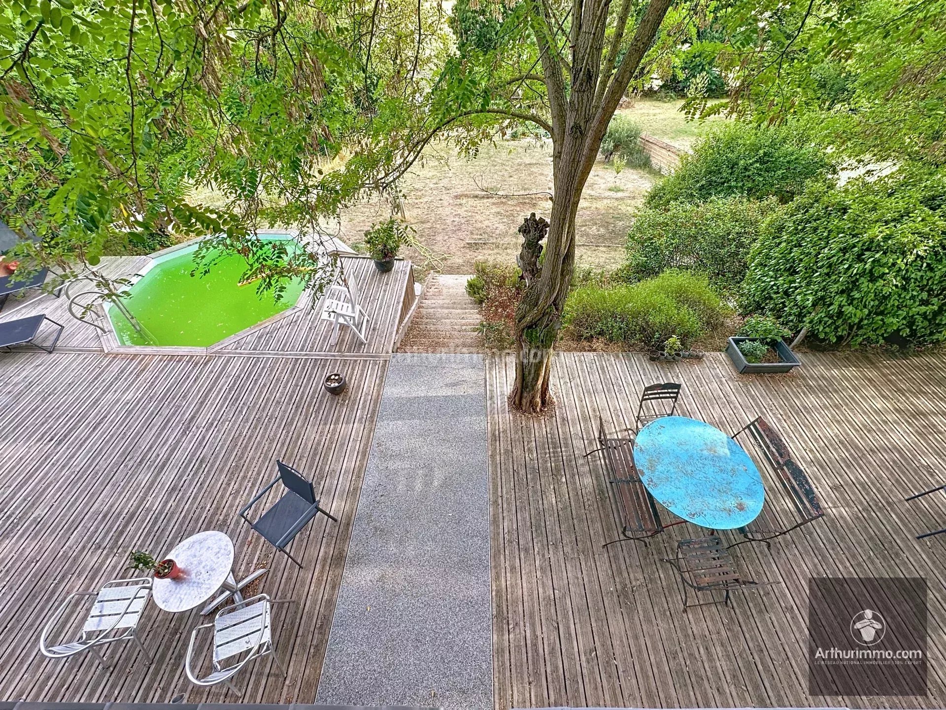 Séjour lumineux de 50 m², ouvrant directement sur le jardin, avec piscine hors-sol et jacuzzi pour des moments de détente en toute intimité.