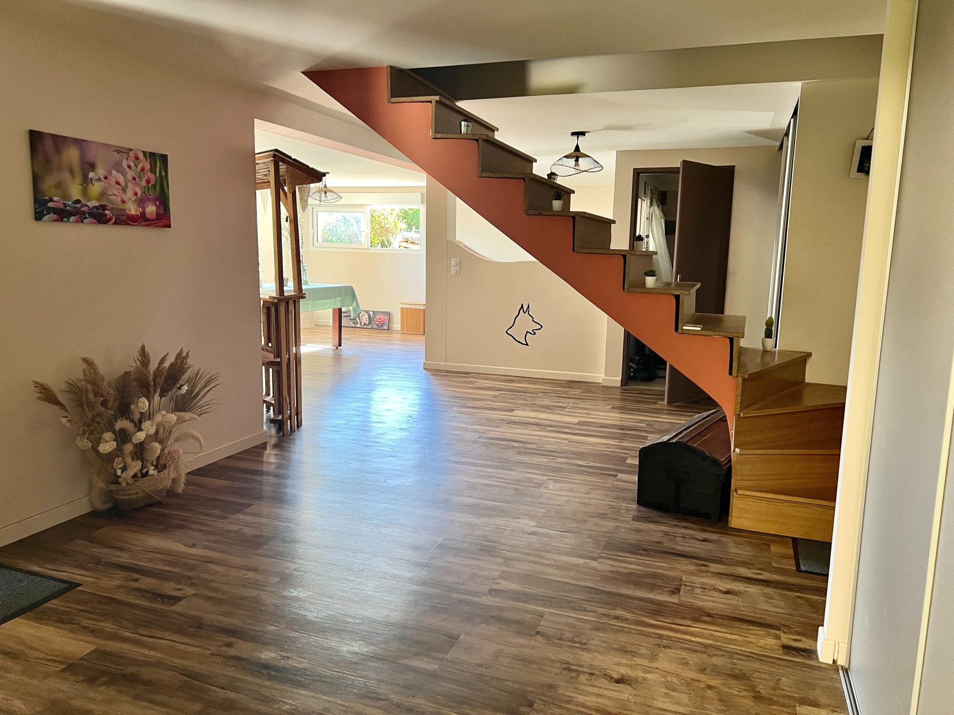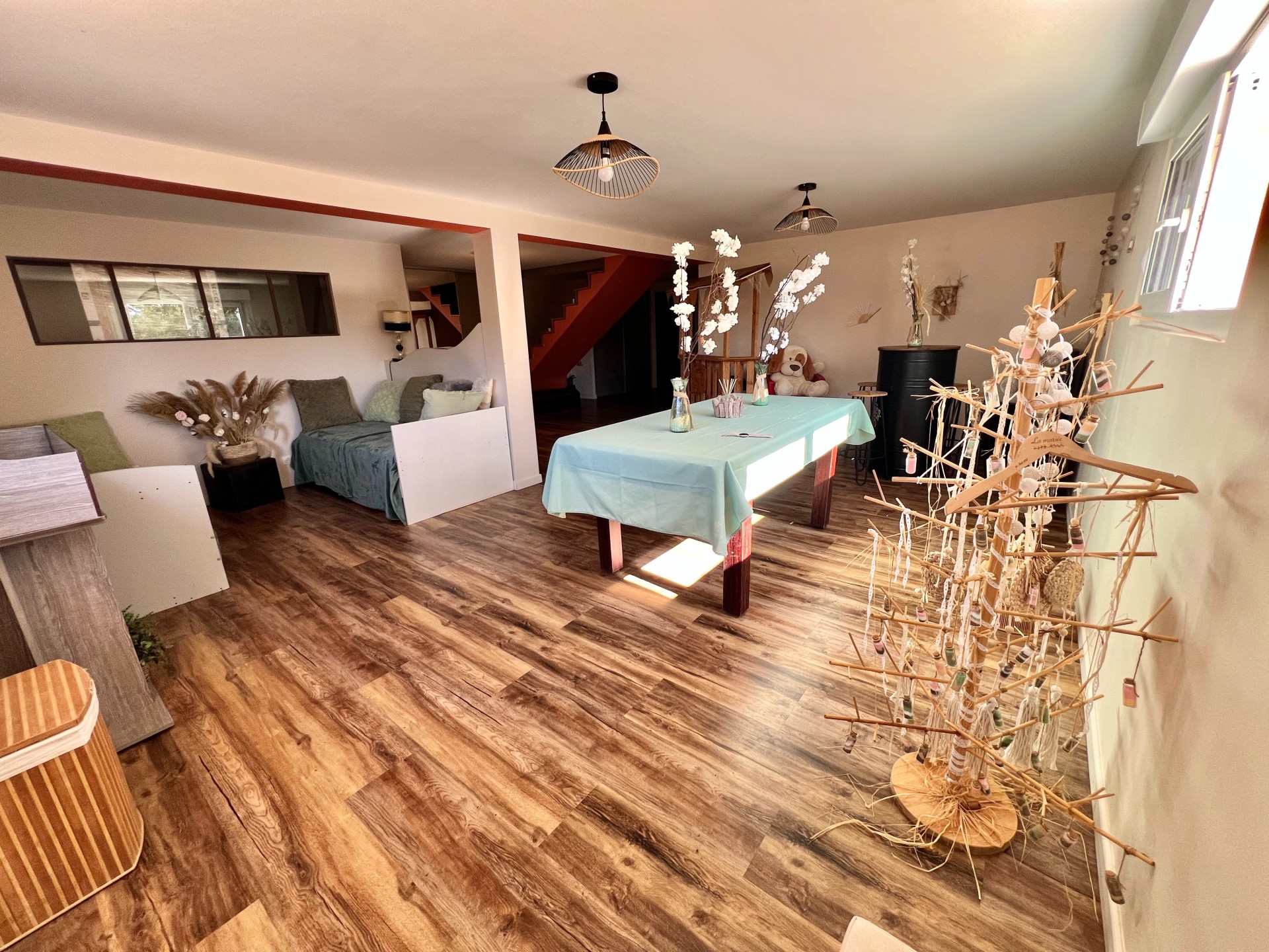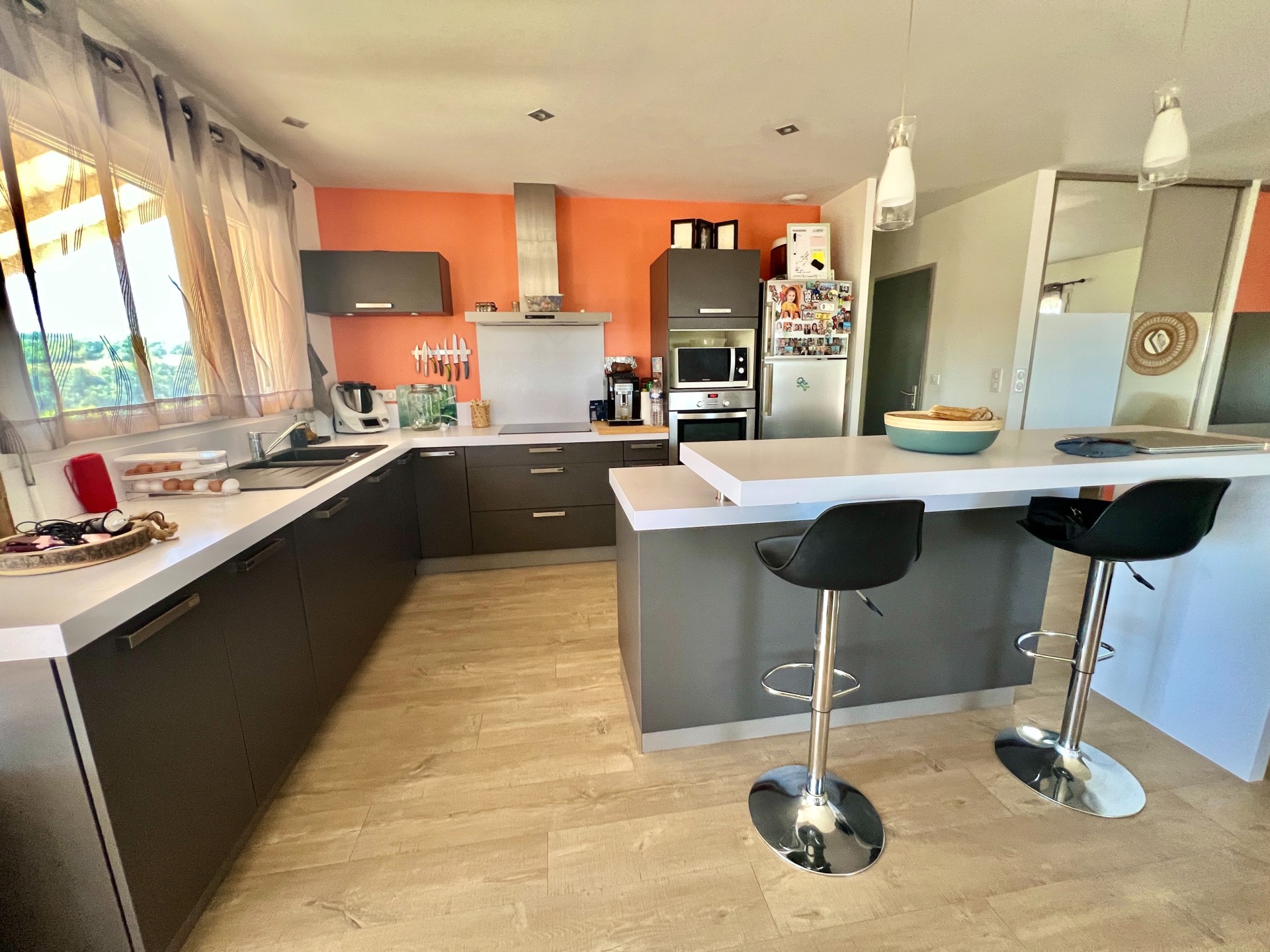 De plain-pied, vous découvrirez une spacieuse et lumineuse pièce de vie de 50m² avec insert, intégrant une cuisine aménagée