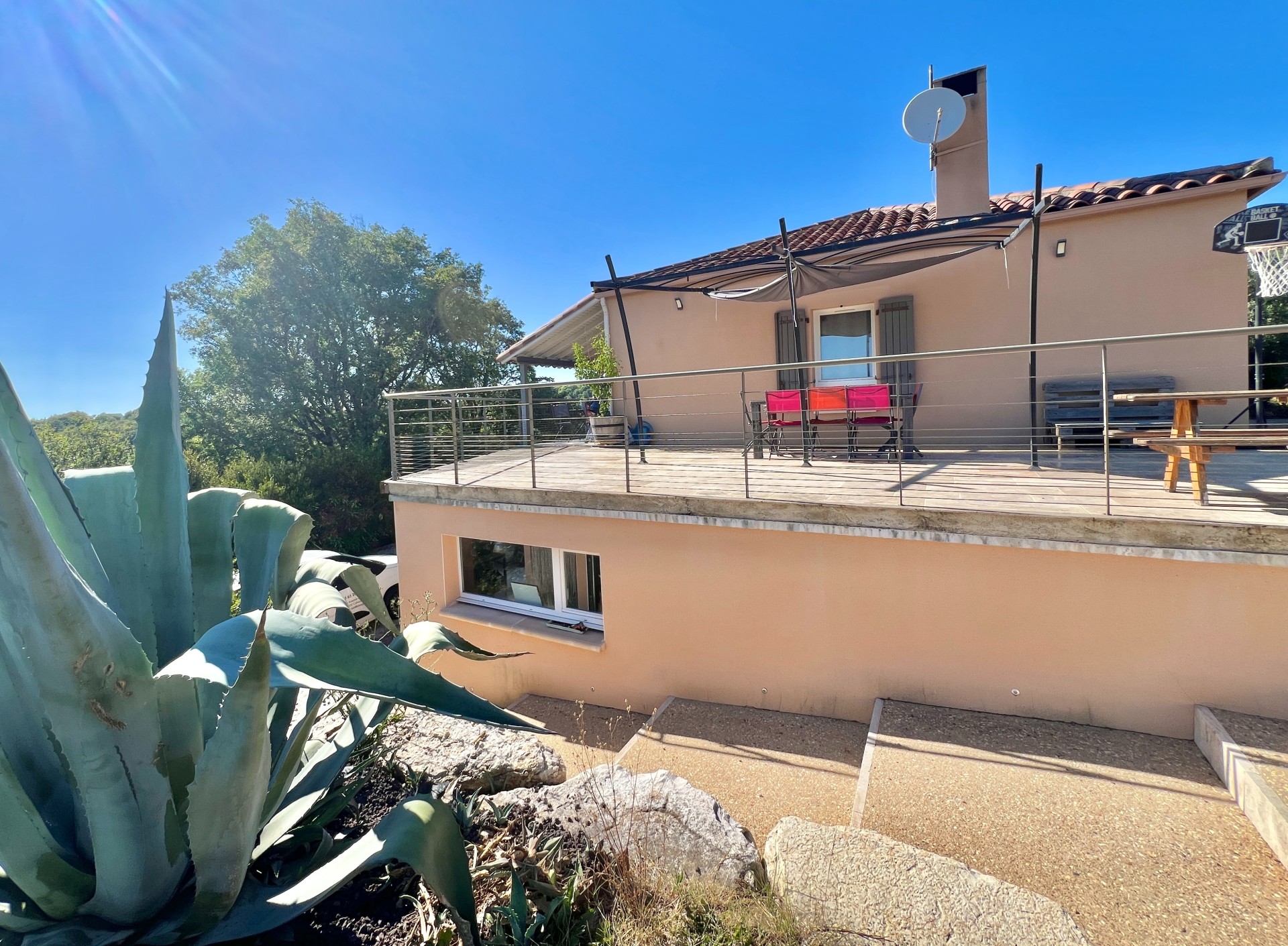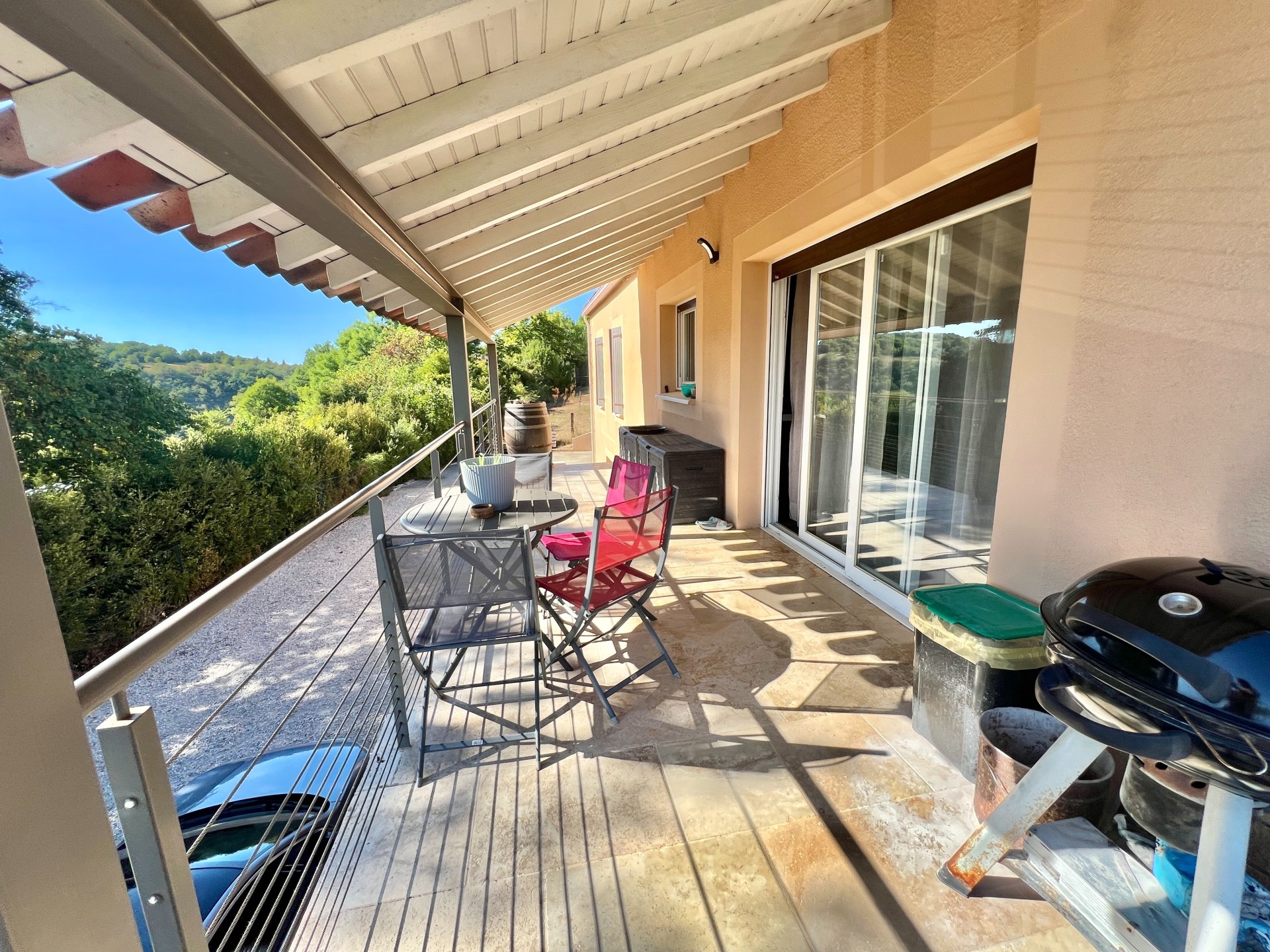 De larges baies vitrées s'ouvrent sur une vaste terrasse avec partie couverte entourant la maison et offrant une vue époustouflante.