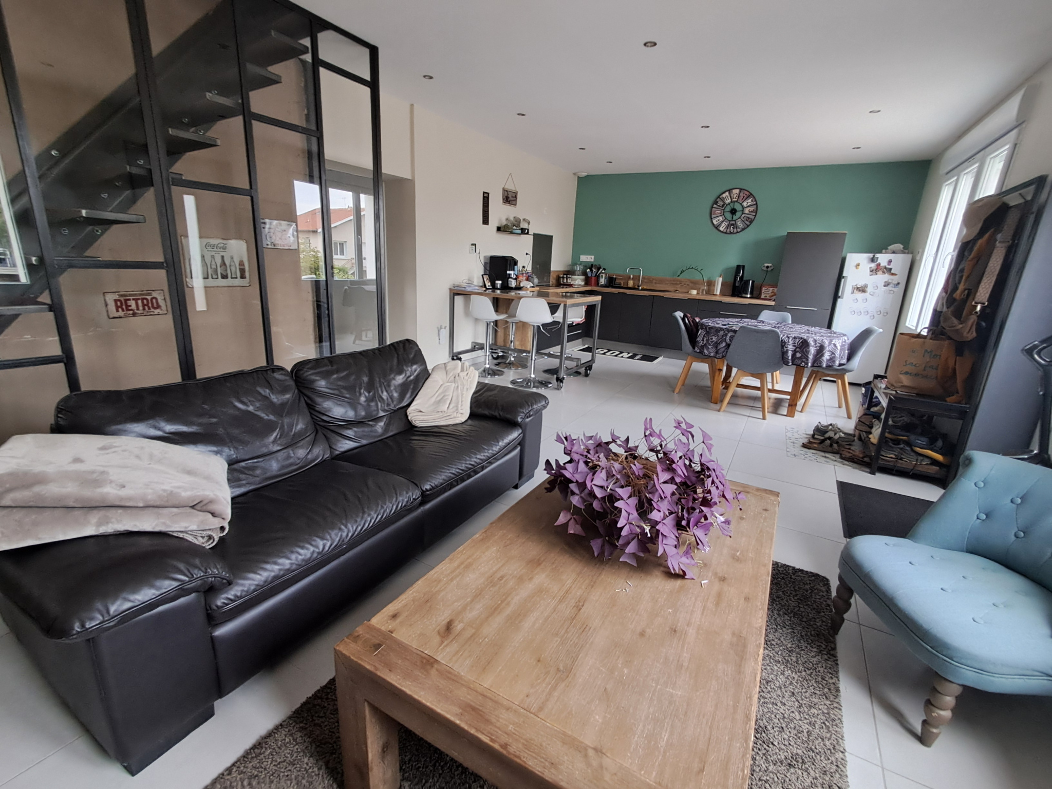 Pièce de vie lumineuse avec cuisine équipée, séjour-salon
