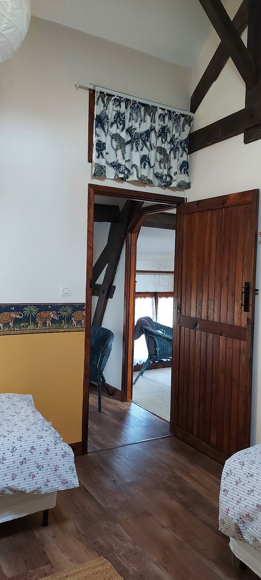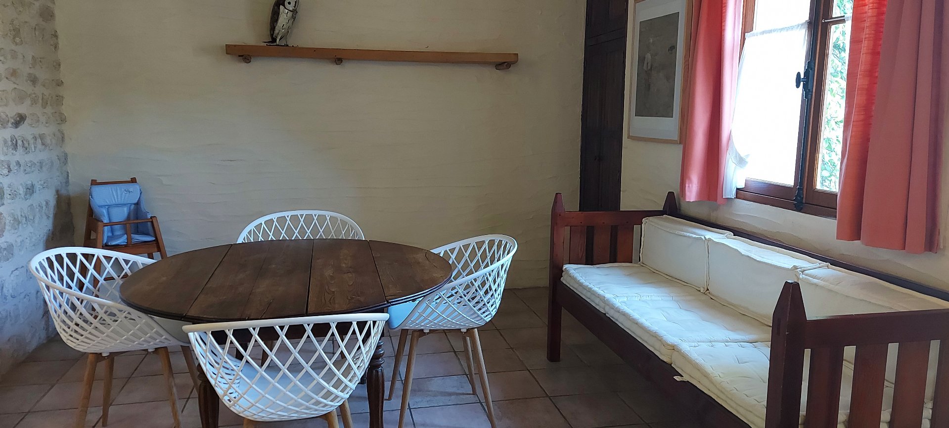 Une première aile comprend une cuisine, un salon avec un poêle à bois, une salle à manger, deux chambres à l'étage, une salle d'eau.