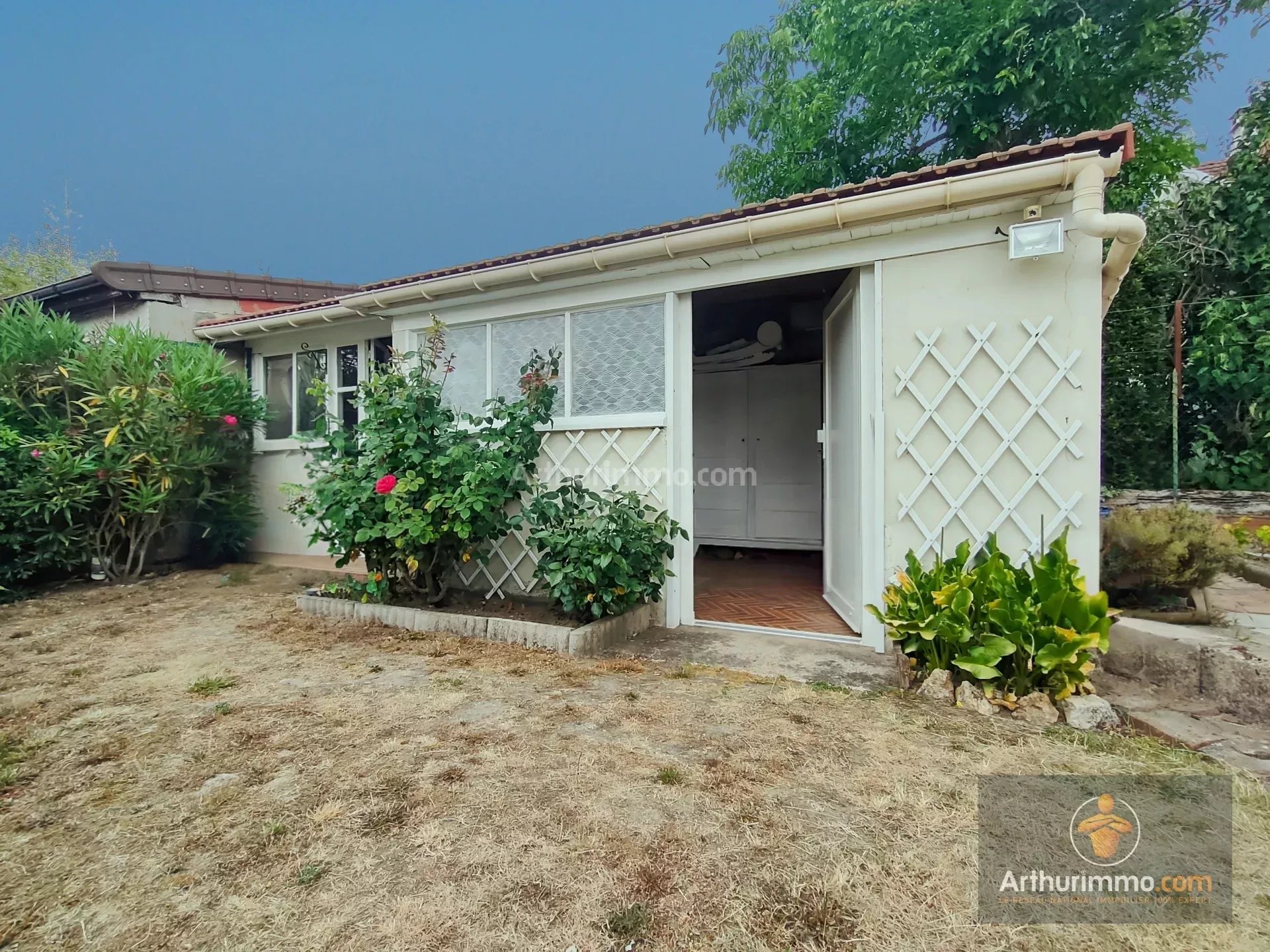 En extérieur : terrasse avec store bane, jardin sans vis à vis, deux dépendances avec électricité et un carport pour un véhicule.