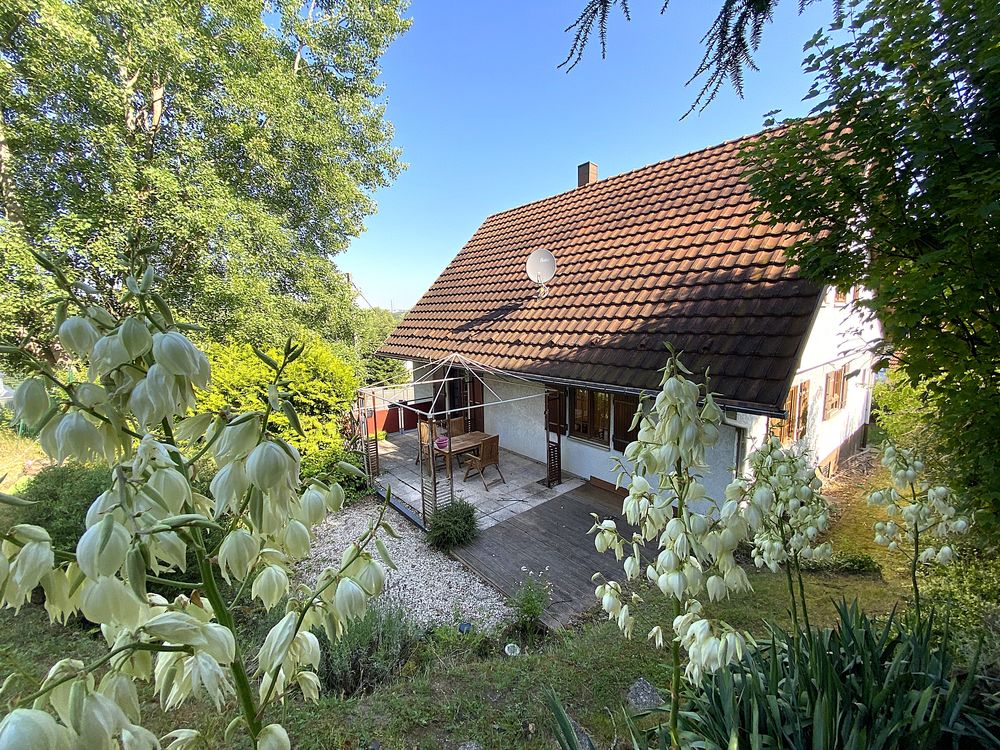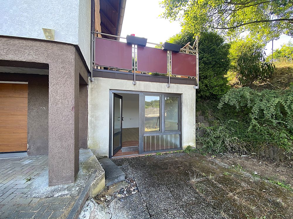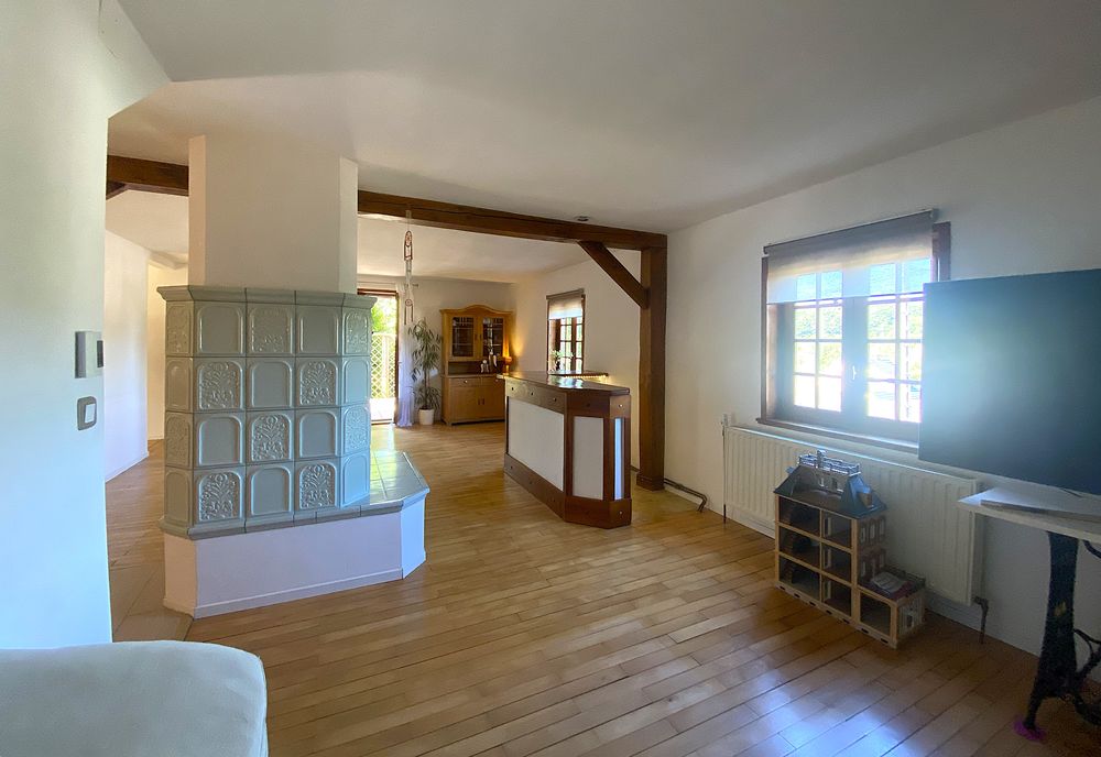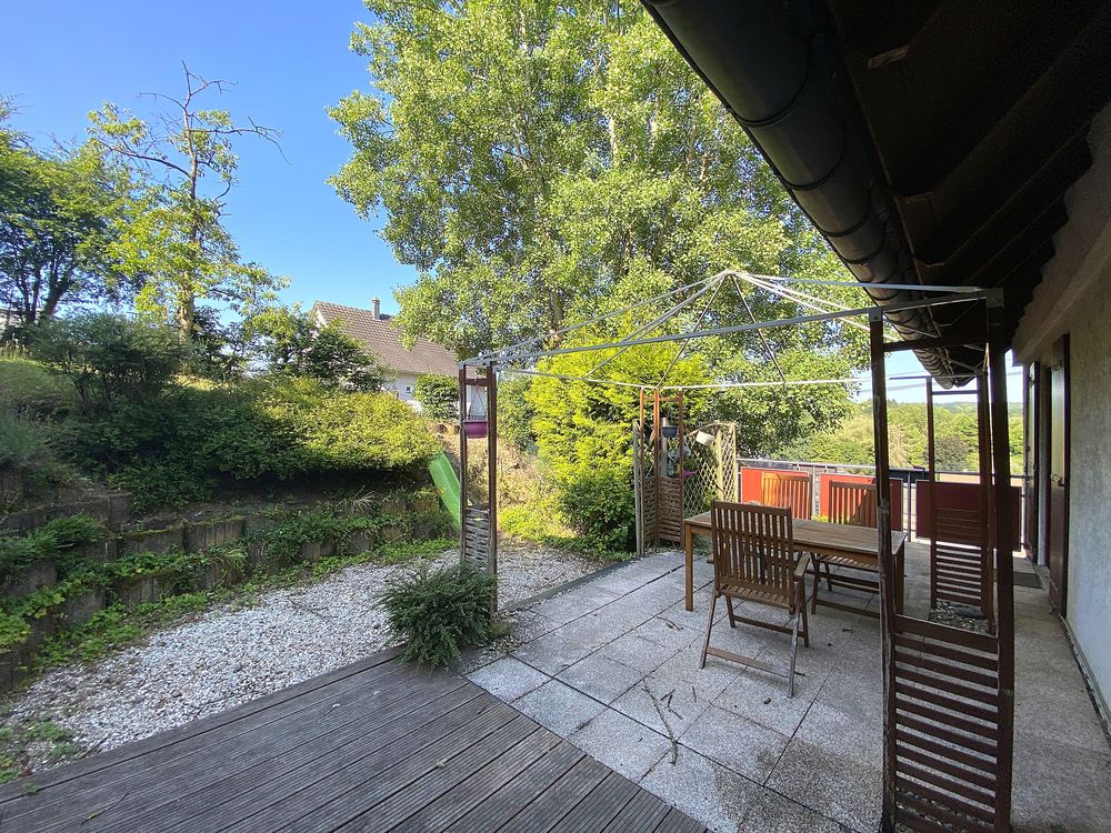 Cette maison individuelle modernisée datant de 1957 (ossature bois), est située dans un endroit calme et idyllique de Petite-Rosselle. Elle dispose d'une surface habitable d'environ 140 m² + un bureau indépendant d'environ 15 m² et d'un terrain de 1018 m².Quelques marches sur le côté mènent à l'entrée au rez-de-chaussée, où se trouvent un salon/salle à manger confortable avec un poêle en faïence (qui doit être réactivé), un bar et l'accès à la terrasse avec jardin. Vous y trouverez également la cuisine moderne et une chambre avec salle de bains attenante (WC, lavabo, douche).