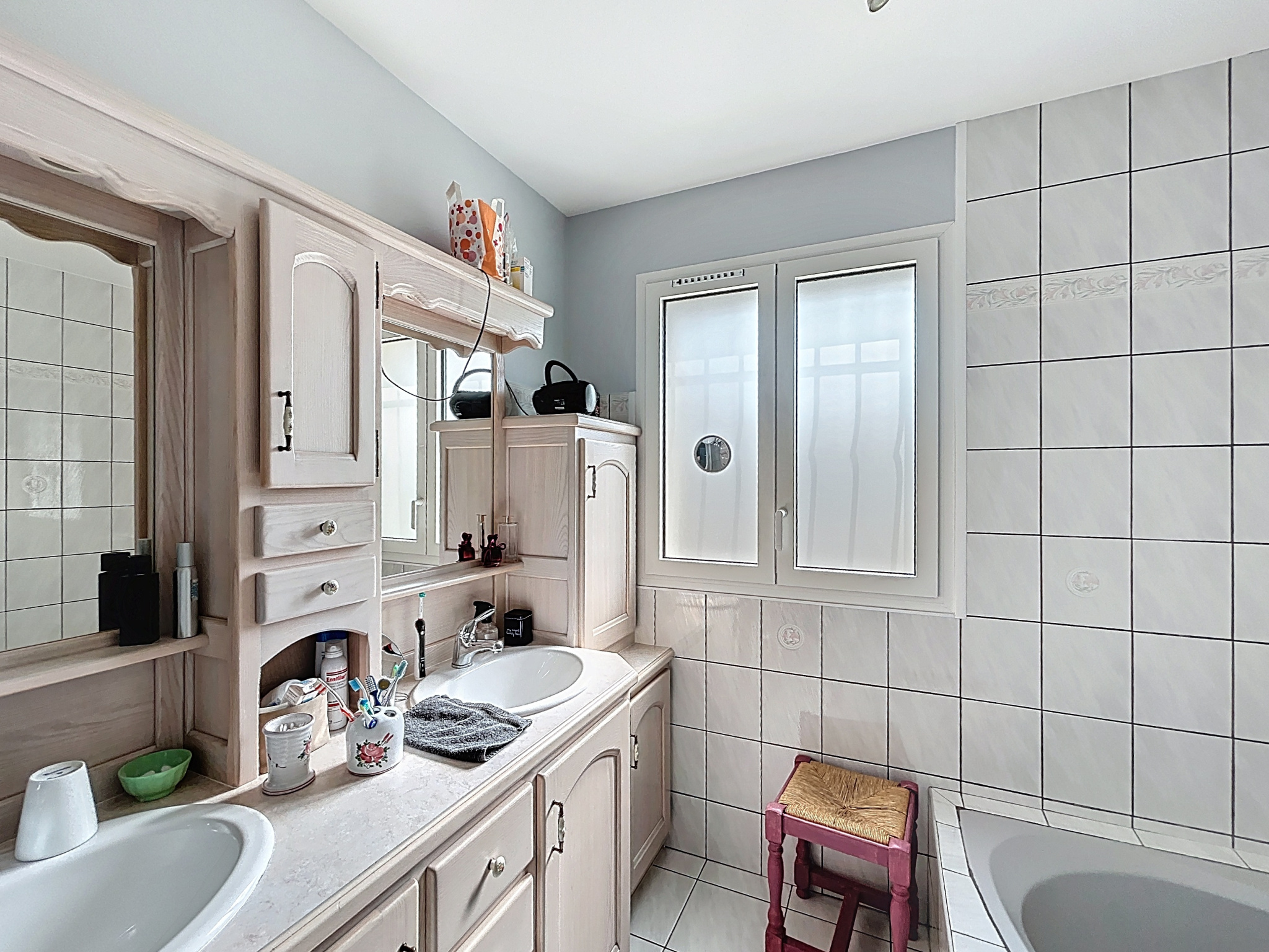 - Salle de bains carrelée, 8,20 m2, avec meuble 2 vasques, douche et baignoire.