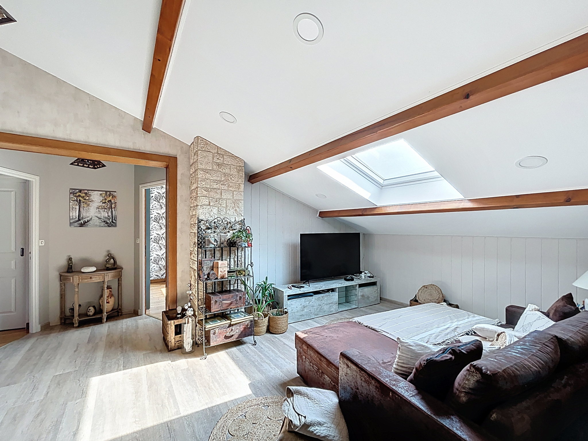 - Pièce centrale salon, 15 m2, sol parquet flottant, fenêtre de toit.