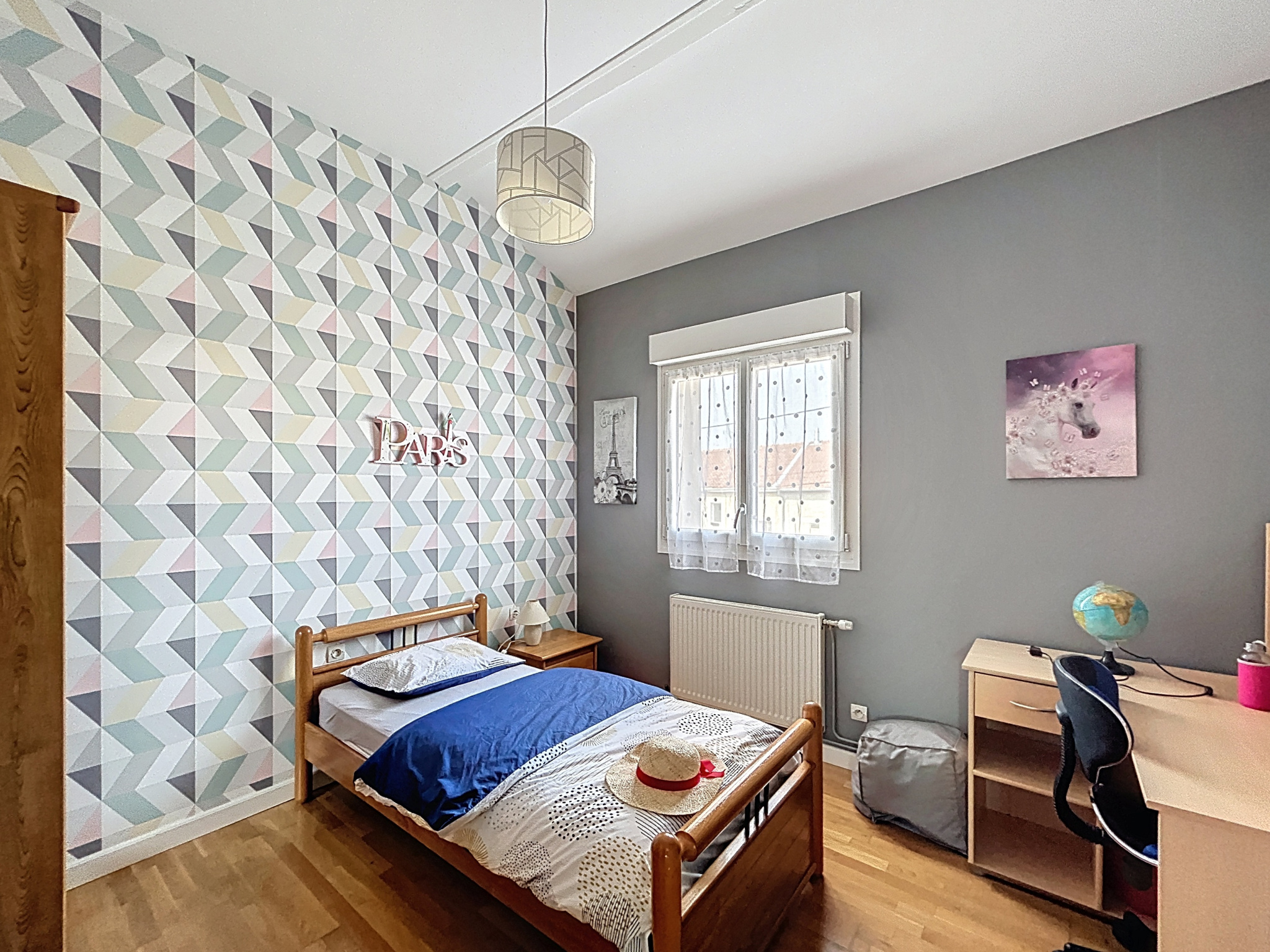 - 1 chambre de 8,70 m2, sol plancher, fenêtre de toit, placard.