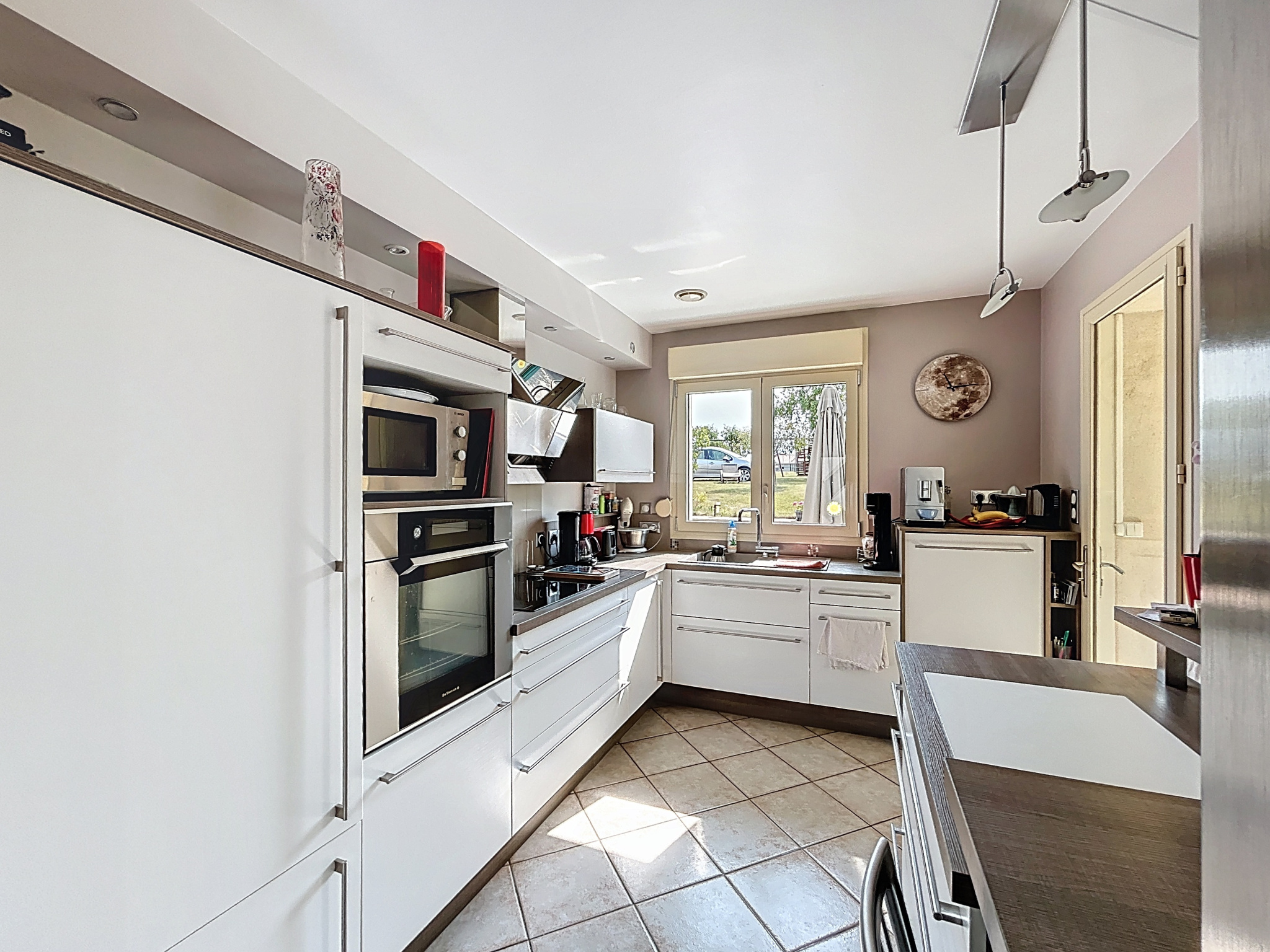 - Pièce de vie de 50 m2 avec salon, séjour et cuisine équipée (éléments hauts et bas, évier, hotte aspirante, plaque induction, four, réfrigérateur, lave-vaisselle), sol carrelage, placard, portes-fenêtres ouvrant sur véranda et terrain.