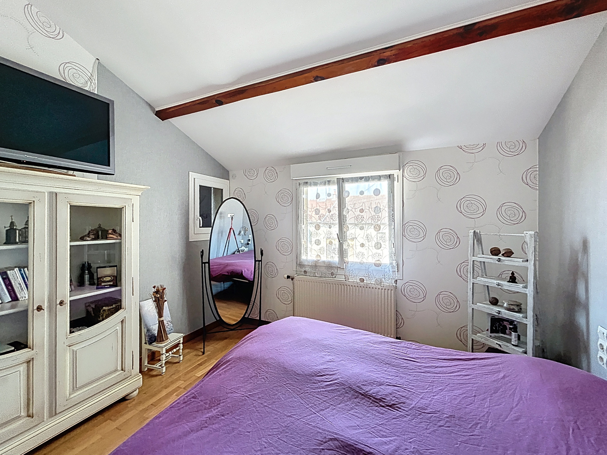 À l'étage, la maison offre trois belles chambres, dont une avec dressing aménagé, un salon TV cosy, une salle d'eau avec WC, une pièce lingerie et un grenier.