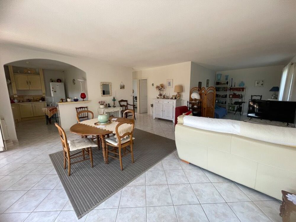 Grande pièce de vie avec cuisine ouverte, lumineuse qui s'ouvre sur une terrasse.
