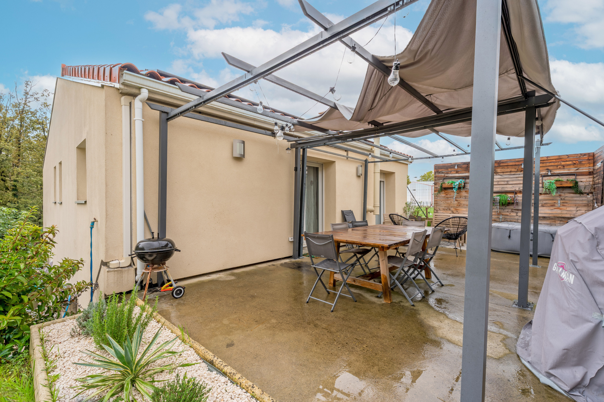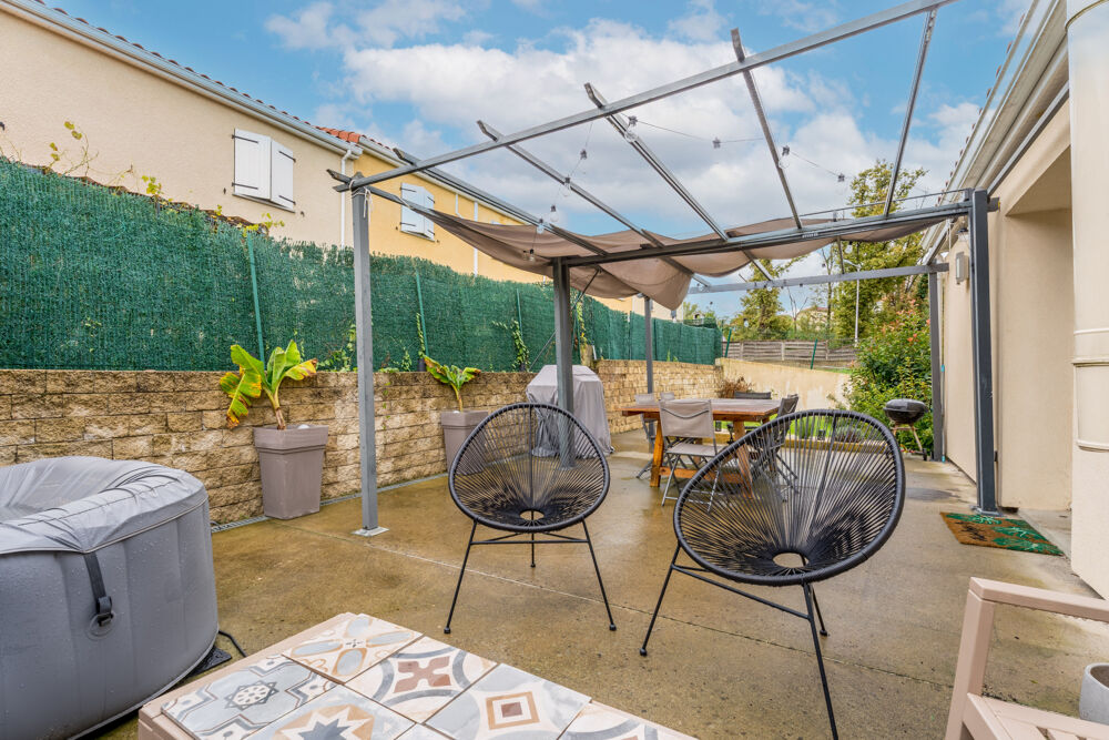 Sur la terrasse coté pièce de vie, vous accèderez à différents espaces dont un coin repas abrité par la pergola, un espace détente avec le jacuzzi et la piscine hors sol, le tout dans un cadre très fonctionnel avec son chemin menant au second portillon pour l'accès côté rue et permettant un accès PMR.