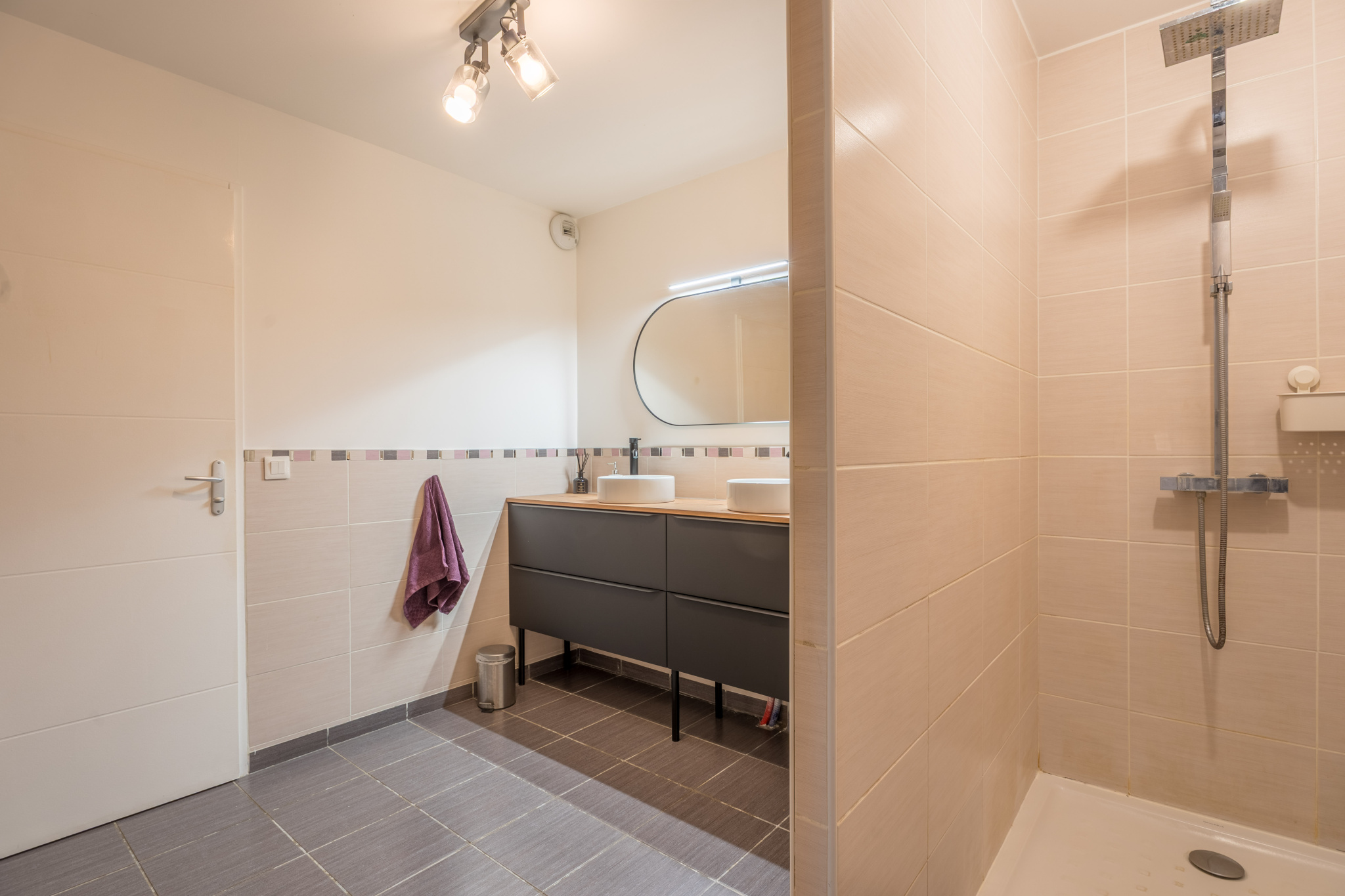 Sur ce niveau, vous trouverez : L'entrée avec rangement sur mesure et l'accès au garage, le coin buanderie, une chambre de 12.5 m2 équipée d'un grand dressing, une pièce borgne de 11.5 m2 avec rangement-dressing, qui peut être utilisée à usage de bureau, de salle de sports, de salle de jeux ou de chambre d'amis. Une grande salle d'eau équipée de 2 vasques avec une douche à l'italienne et un WC séparé.