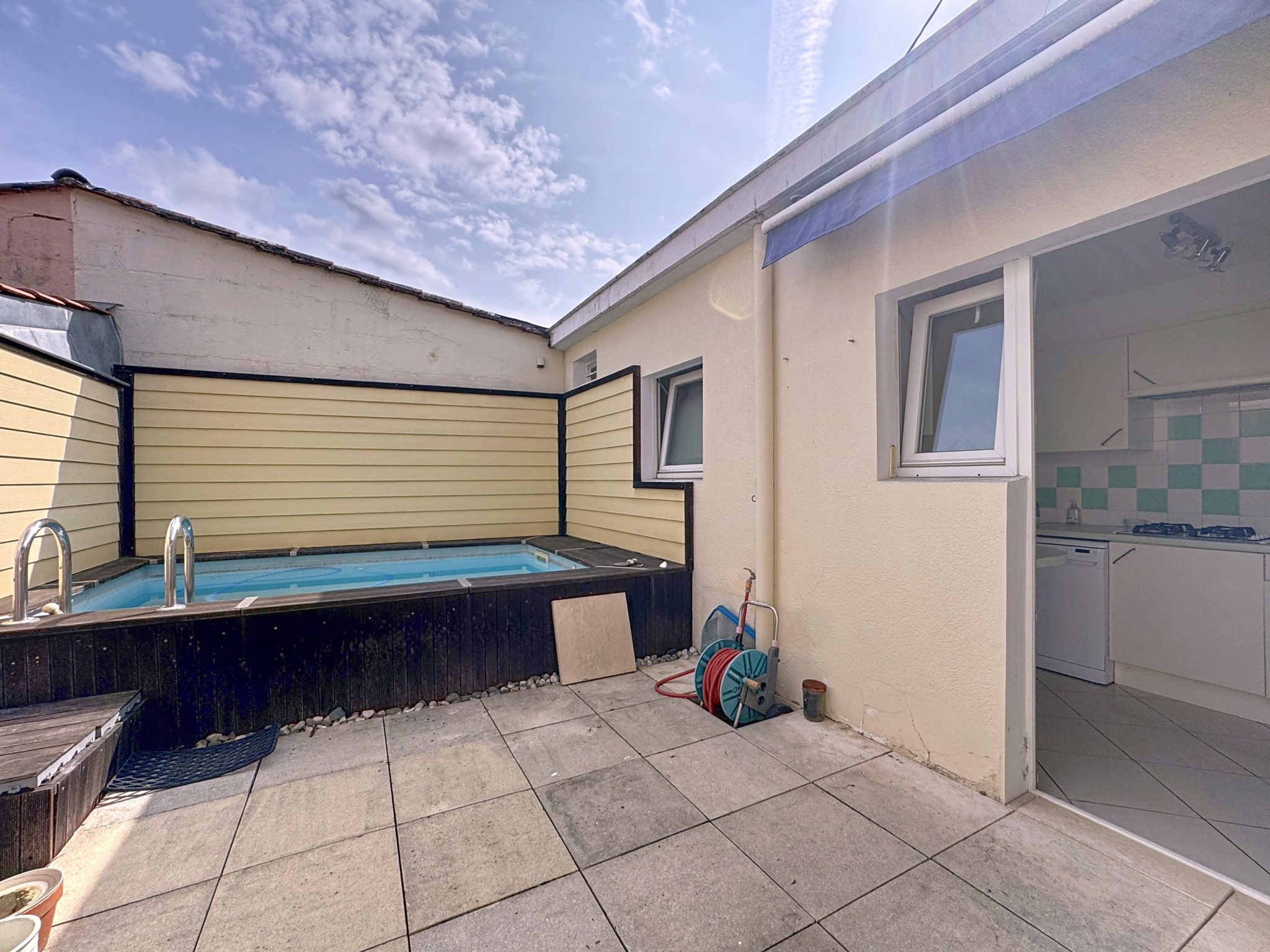 À l'arrière de la maison, une jolie cour sans vis-à-vis accueille une petite piscine, parfaite pour se détendre et profiter des beaux jours en toute tranquillité.