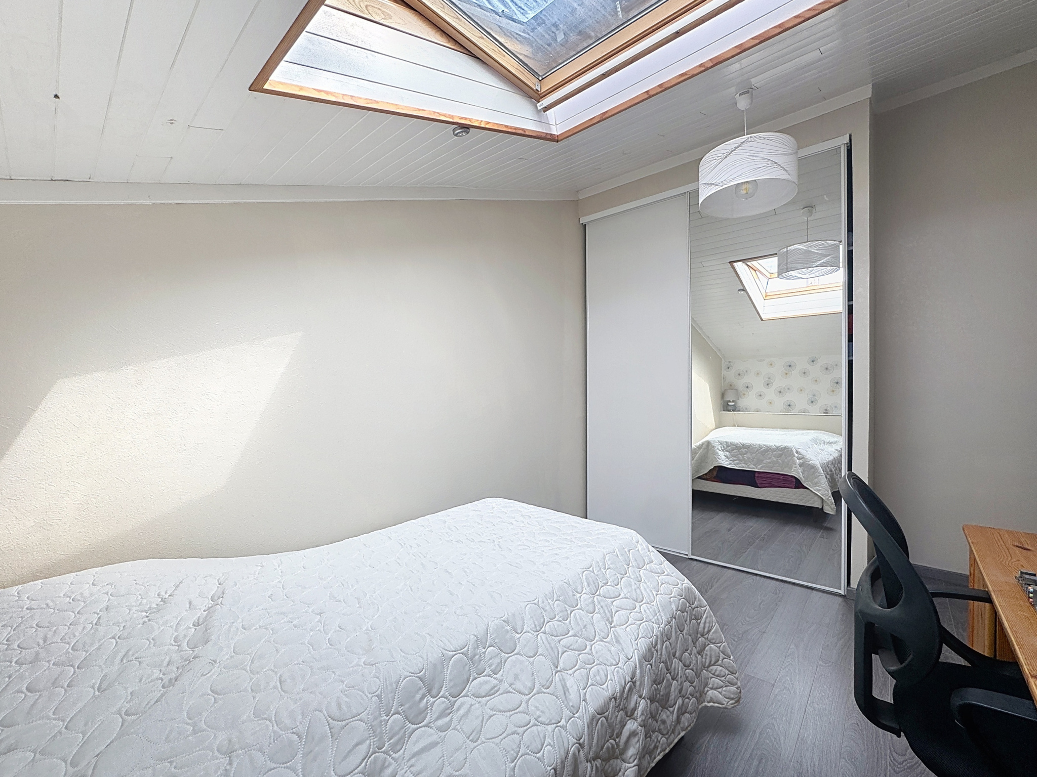L'étage se compose d'un palier qui dessert trois chambres confortables, dont deux équipées de placards, ainsi qu'une salle de bains.