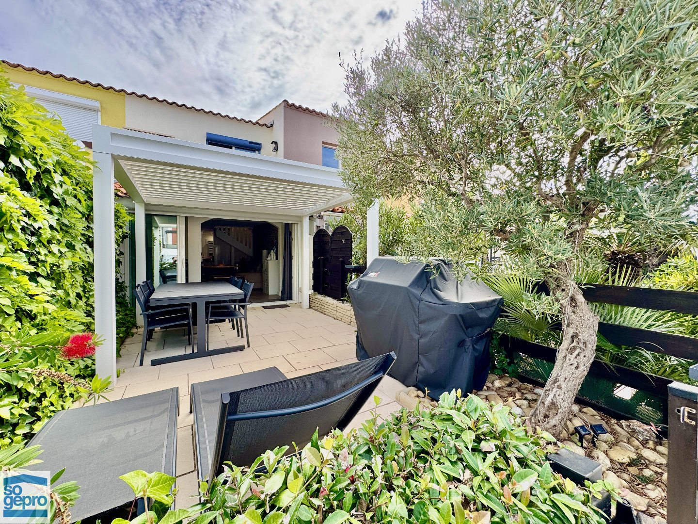 Au rez-de-chaussée : un bel espace de vie climatisé avec cuisine ouverte et équipée, une loggia intégrée donnant sur une terrasse équipée d'une PERGOLA BIOCLIMATIQUE, ainsi qu'une seconde terrasse exposée PLEIN SUD.