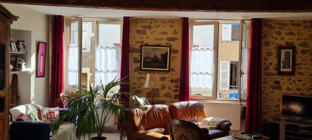 Hyper centre de LA CLAYETTE. Belle et grande maison entièrement rénovée, entrée, escalier, grand séjour-salon, cuisine meublée, arrière cuisine-buanderie, WC; à l'étage, un bureau ouvert sur mezzanine, deux chambres, salle d'eau avec douche et baignoire, CLIMATISATION, WC séparés. En rez de chaussée, grand garage ( porte électrique), atelier, chaufferie ( gaz), WC. Cave. Parking- cour sur l'arrière. EXCELLENT état général, clim, douche et bains, 3 WC, monte escalier ...très bonnes prestations.