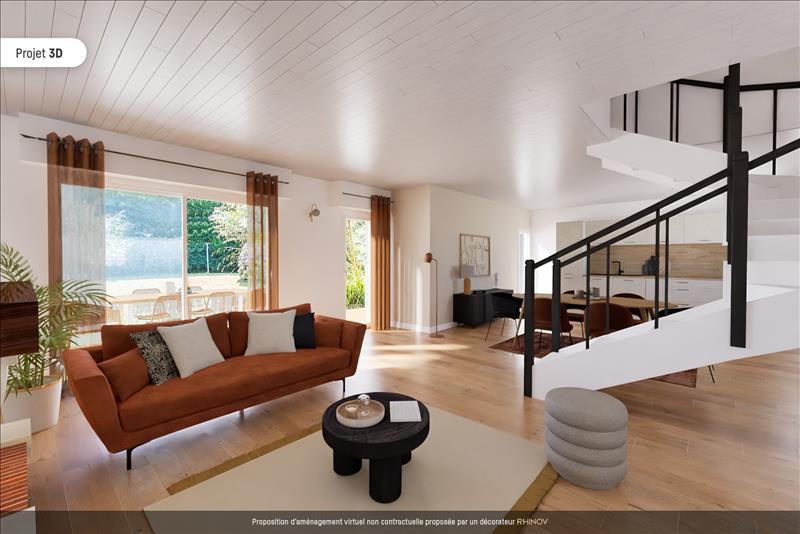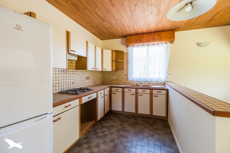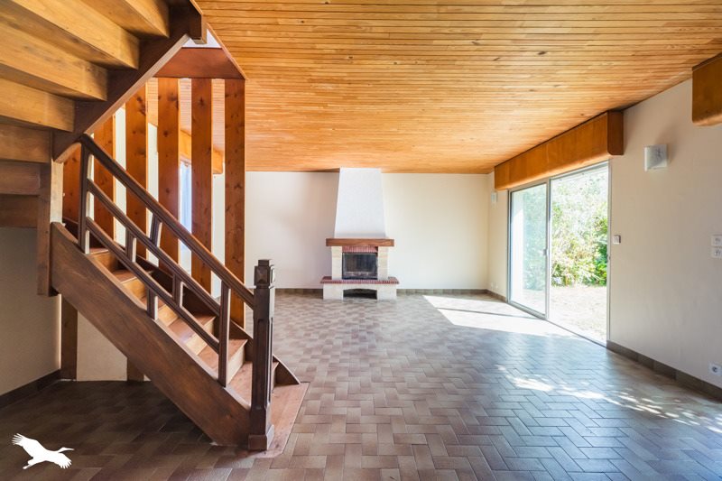 Au rez de chaussée, cette maison propose un agréable espace de vie avec cheminée et cuisine ouverte.