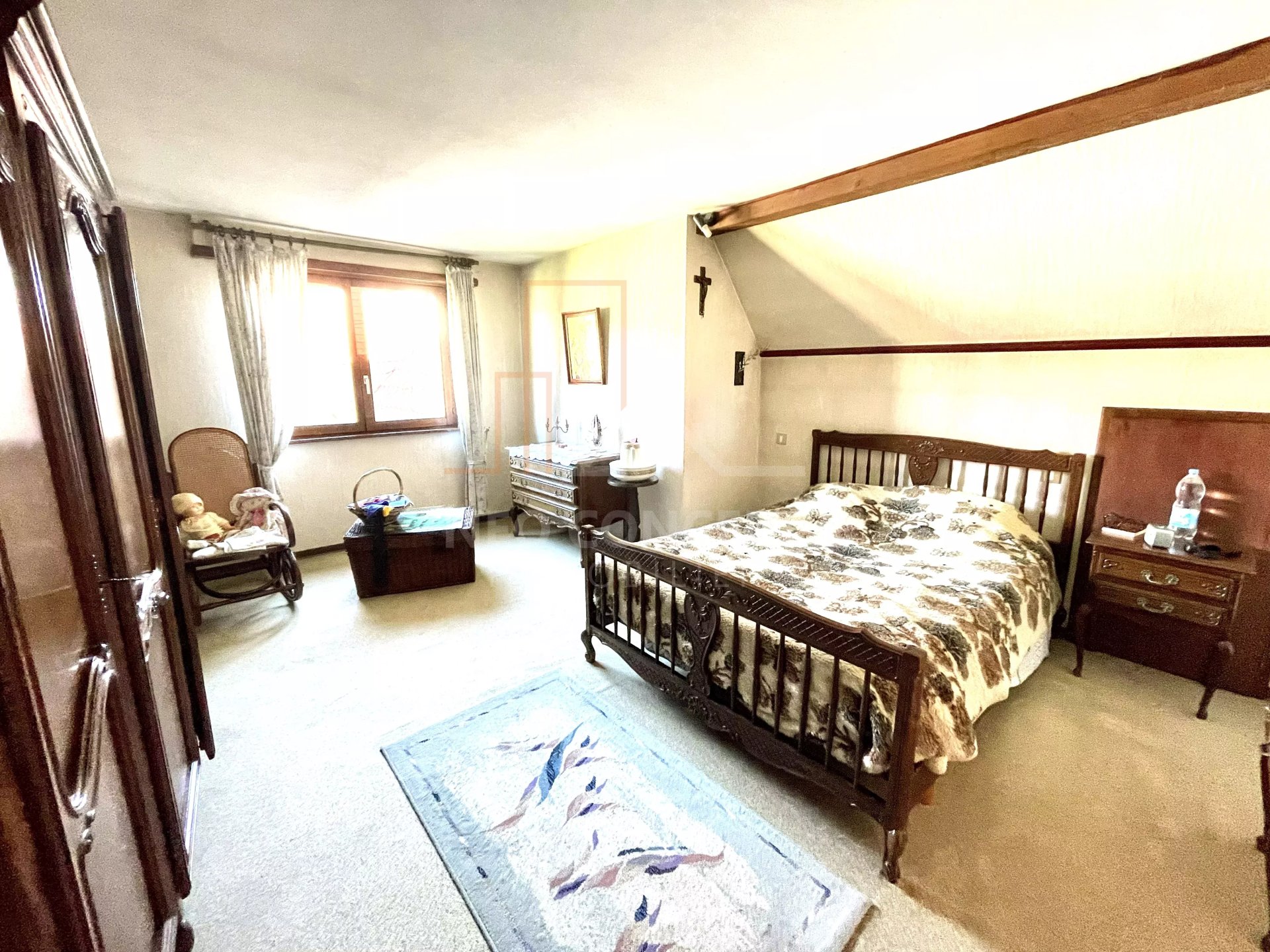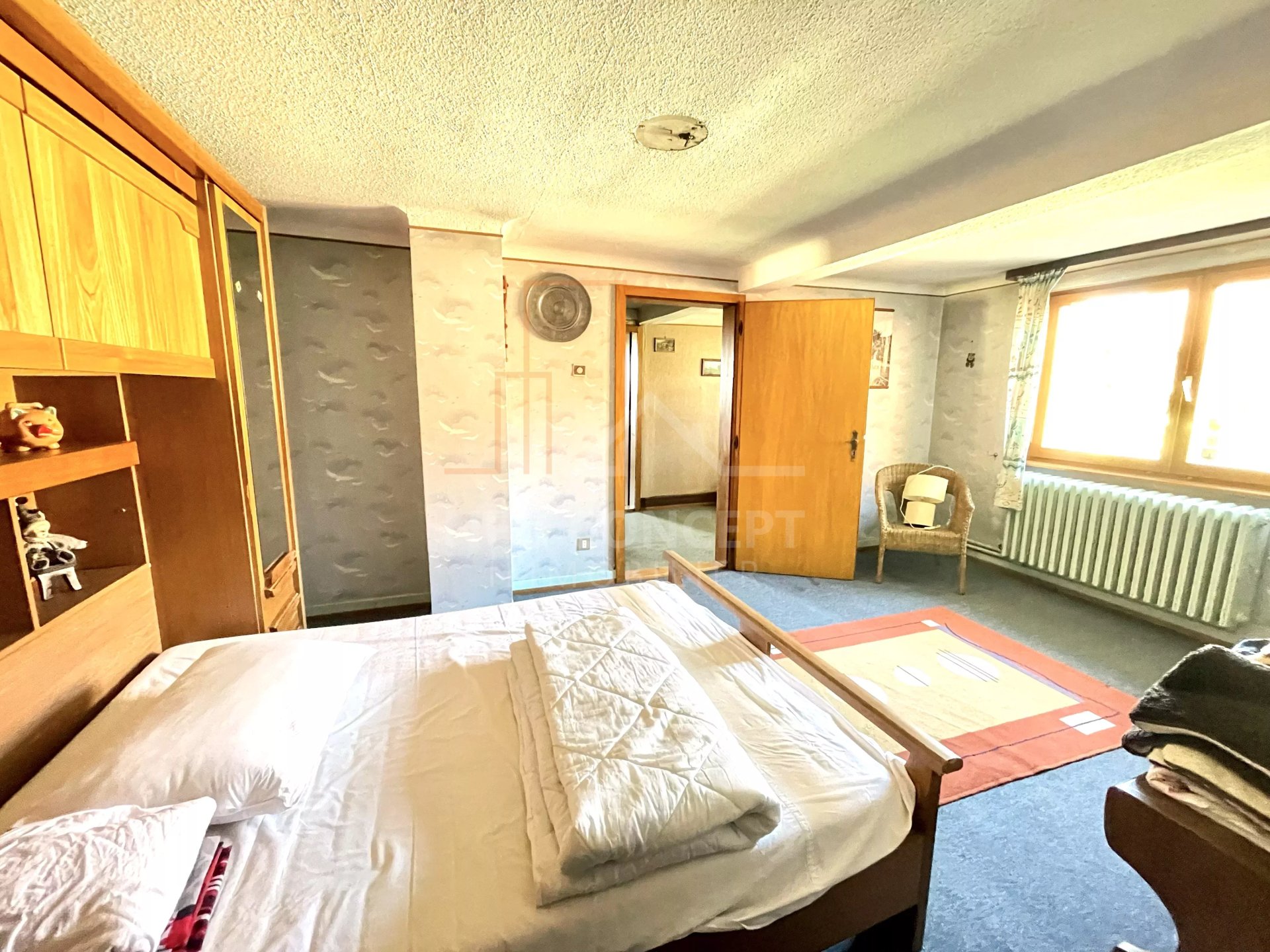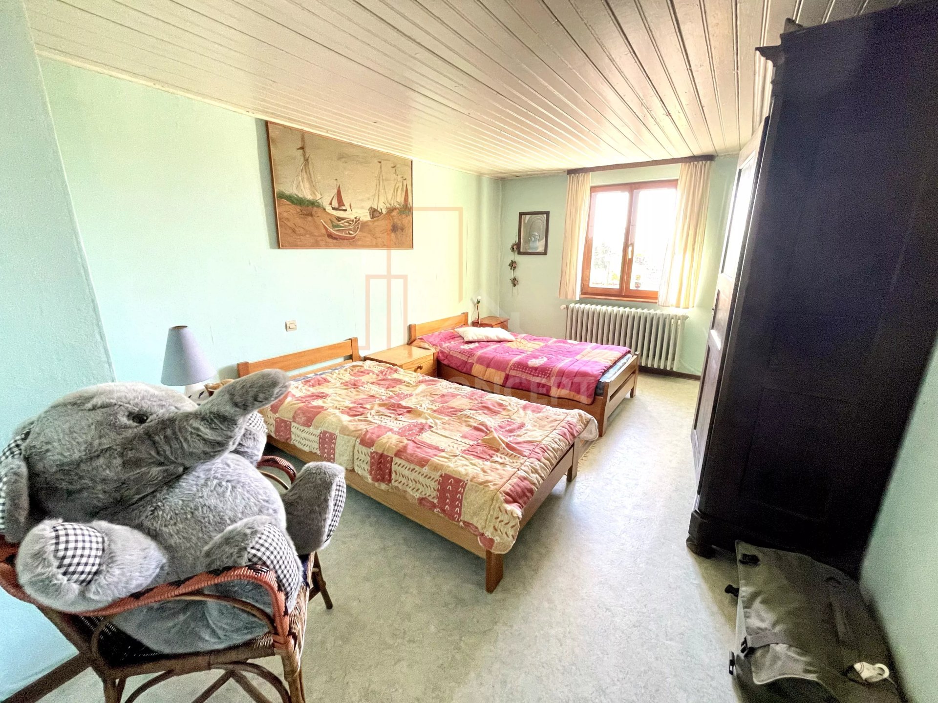 À l'étage vous trouverez un dégagement, une salle de bains, une grande chambre d'environ 18 m² et une chambre double d'environ 34 m².