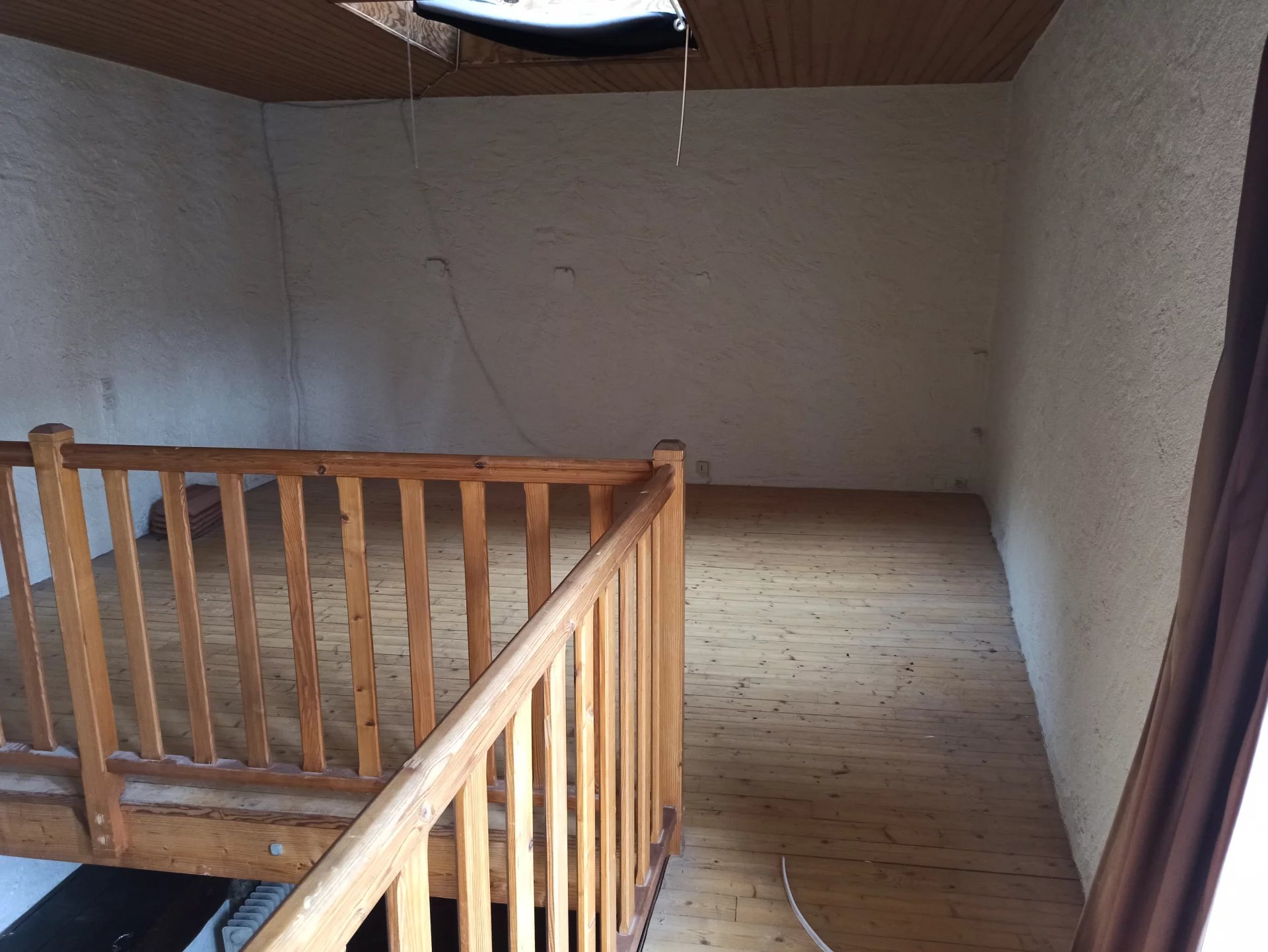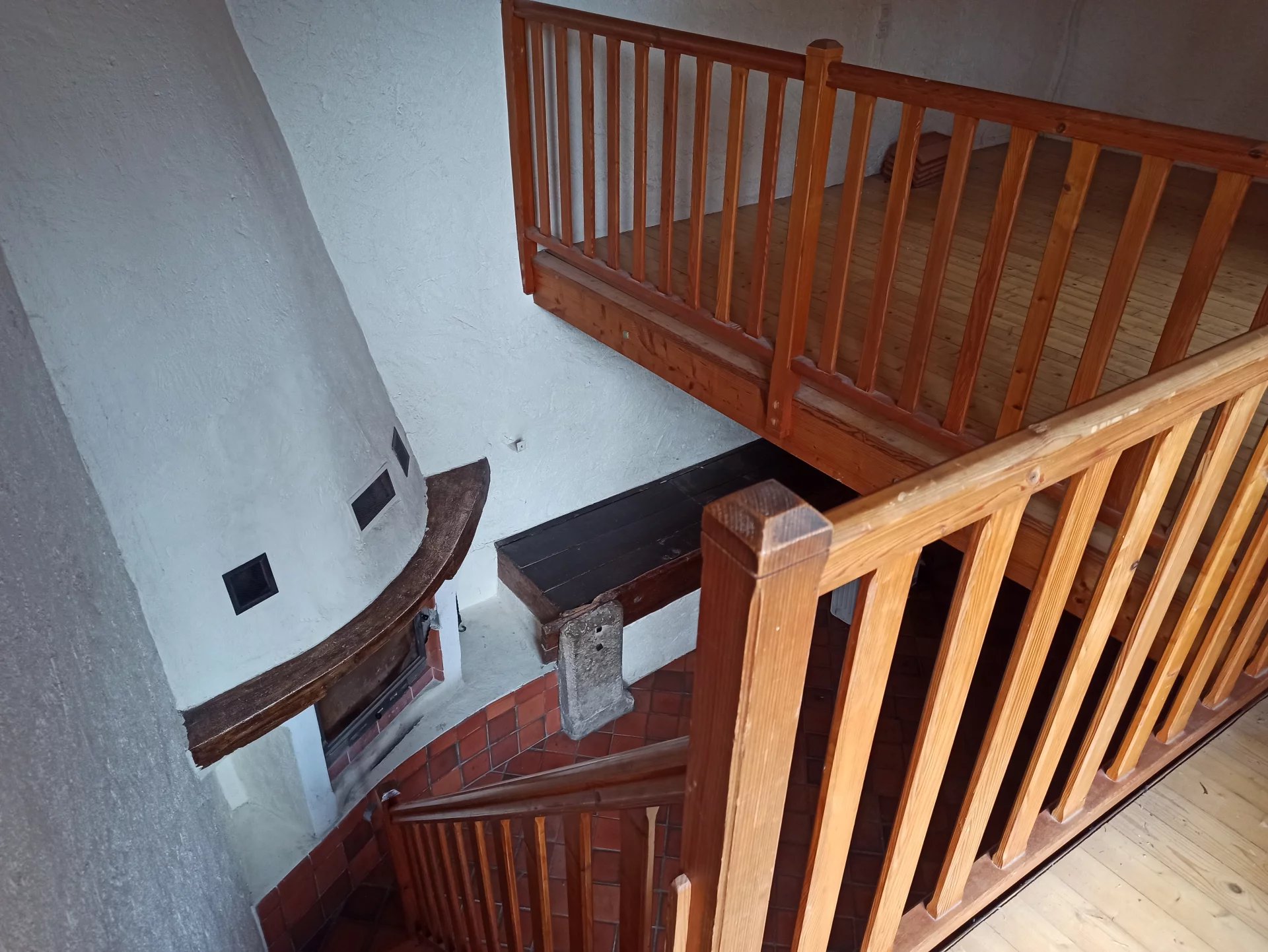 Au premier étage : une grande mezzanine avec Velux ; une chambre avec cheminée.