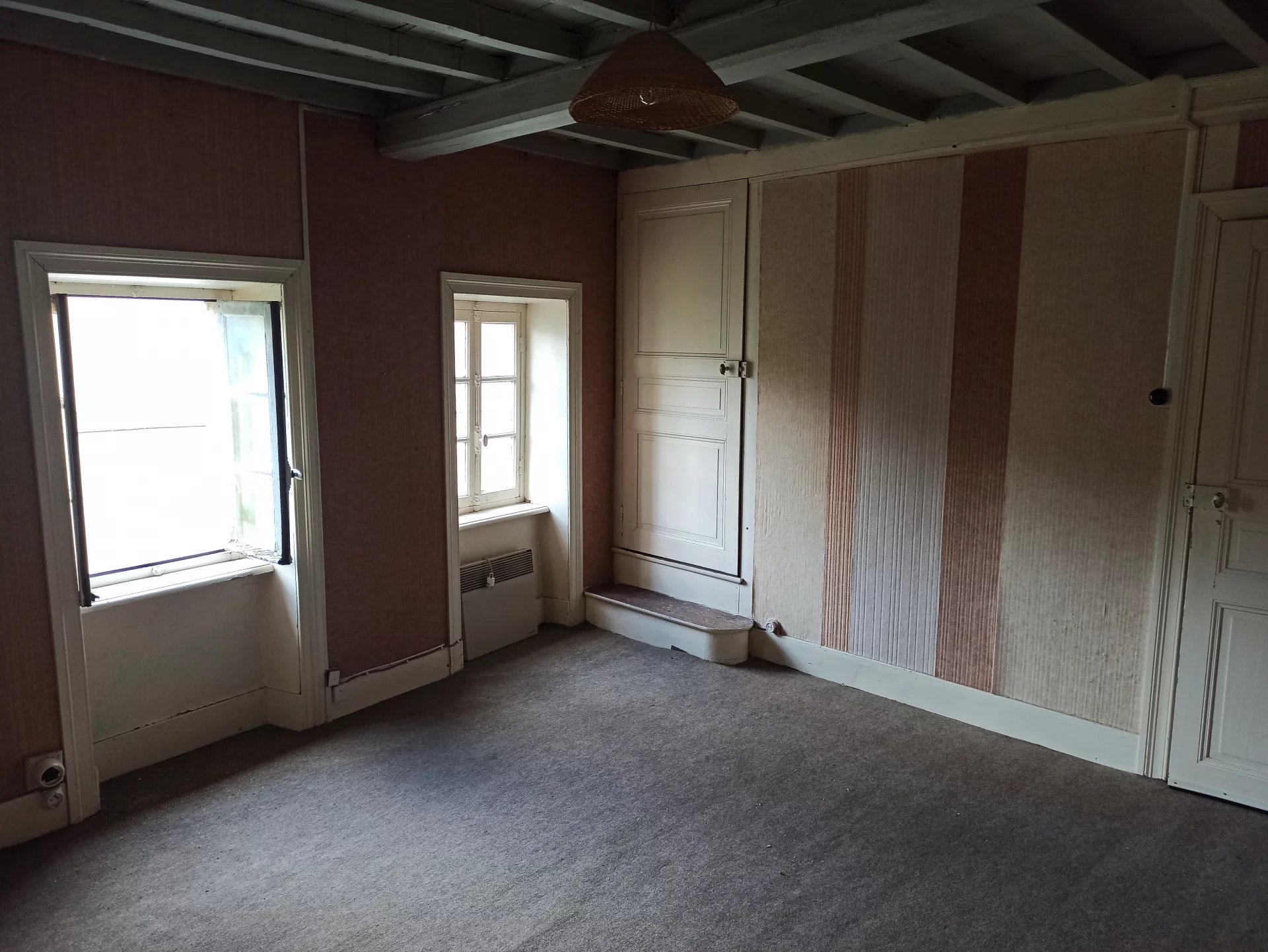 Au rez-de-chaussée : grand séjour avec poutres apparentes, insert et tomettes.