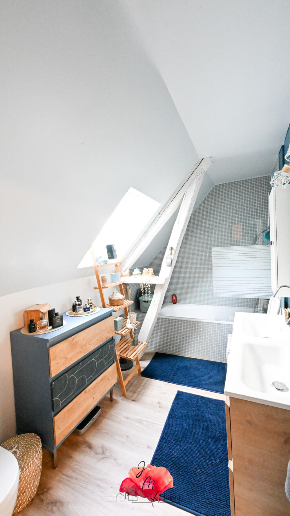 À l'étage, l'espace nuit propose trois chambres, dont une élégante suite parentale, ainsi qu'une salle de bain familialeet un bureau/dressing selon vos besoins.