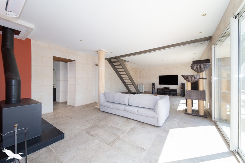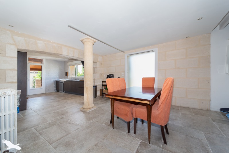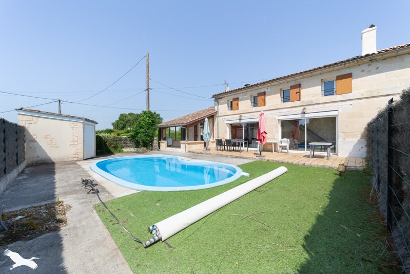 Maison en pierre rénovée sur un terrain de 1192 m² avec piscine et garage non attenant.
