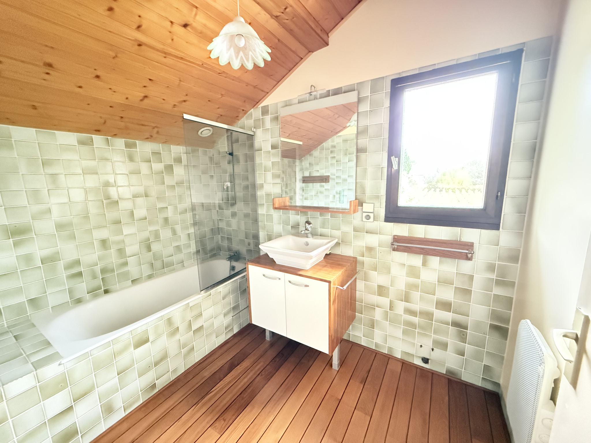 Prestations de qualité avec un chauffage au sol et une chaudière au gaz de ville neuve, une WMC double flux, et des panneaux solaires photovoltaïques récents générant un rendement d'environ 1800€/an.