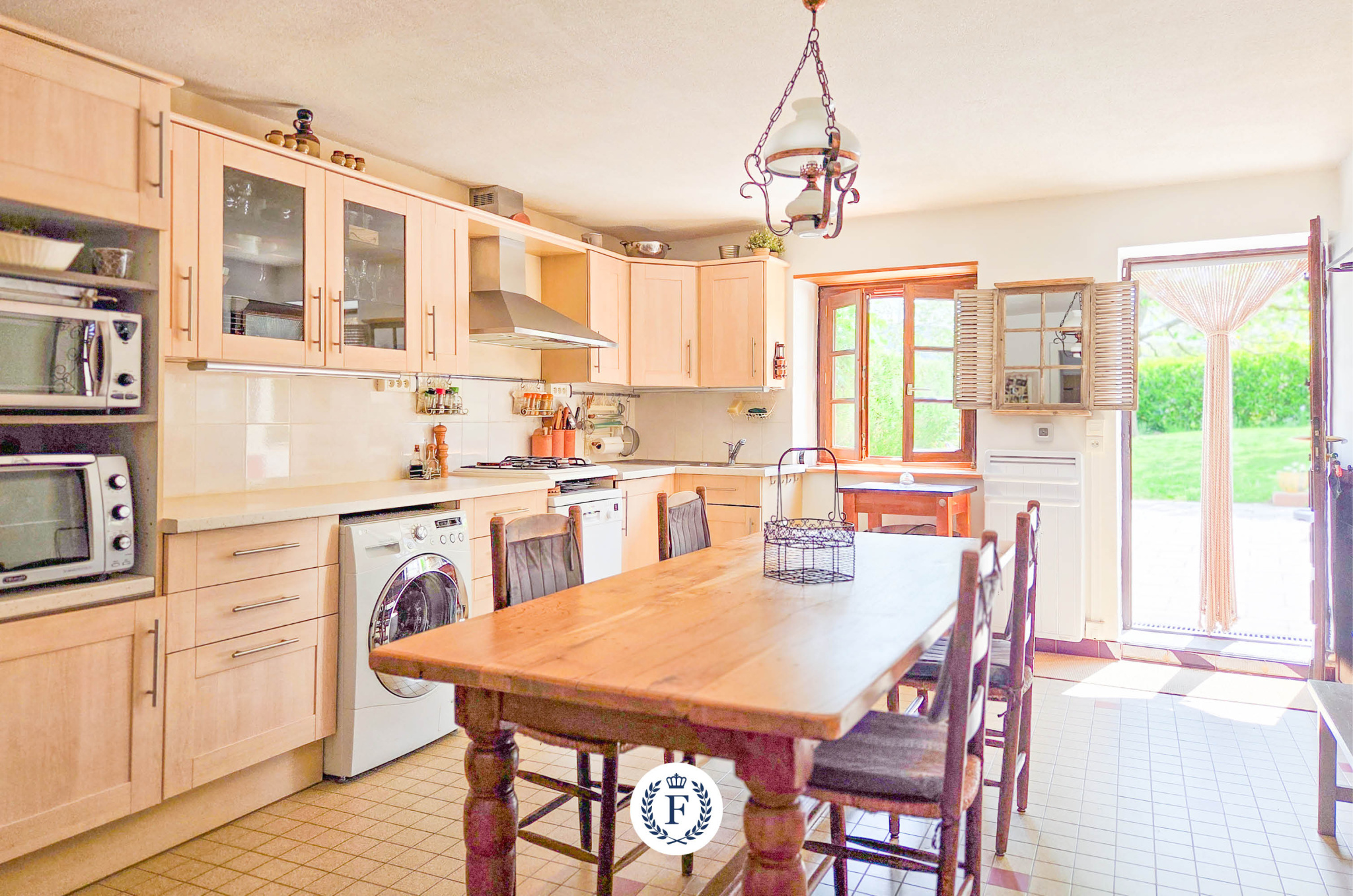 Au rez-de-chaussée: une spacieuse pièce de vie avec salon et salle à manger, agrémentée d'un insert bois pour des soirées chaleureuses, une cuisine indépendante ouvrant sur le jardin, ainsi qu'une salle d'eau et des WC séparés.