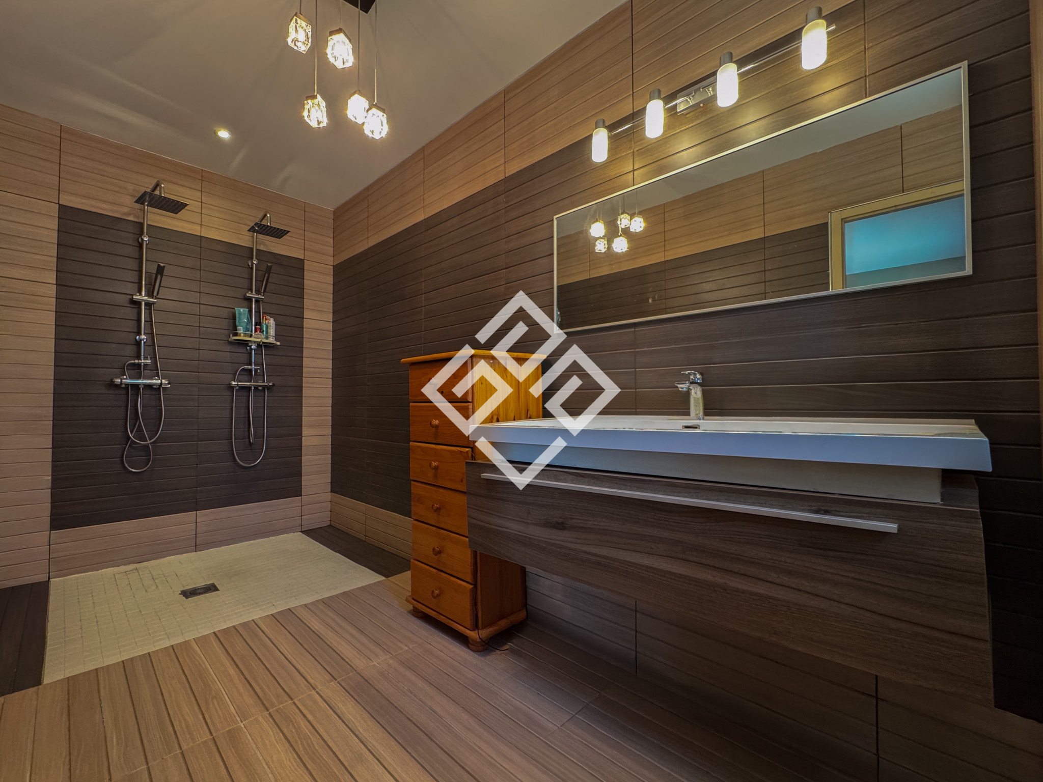 Le rez-de-chaussée s'ouvre sur une pièce de vie de 50 m2, inondée de lumière grâce aux larges baies vitrées donnant sur la terrasse et la piscine. Dans son prolongement, une cuisine moderne de 17 m2 équipée d'une baie à galandage permet également de profiter d'un accès direct à l'extérieur et au panorama.Une arrière-cuisine de 8 m2 complète cet ensemble.