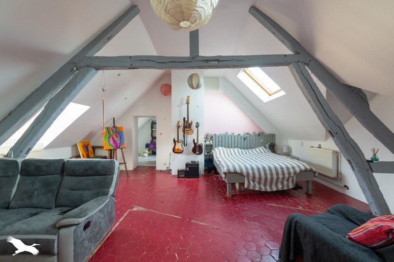 Combles aménagés en une vaste chambre et sa salle de bains avec douche, baignoire et wc.