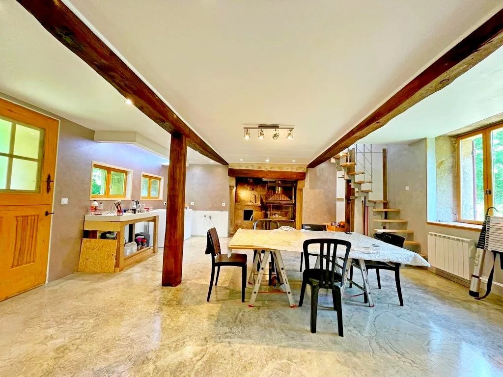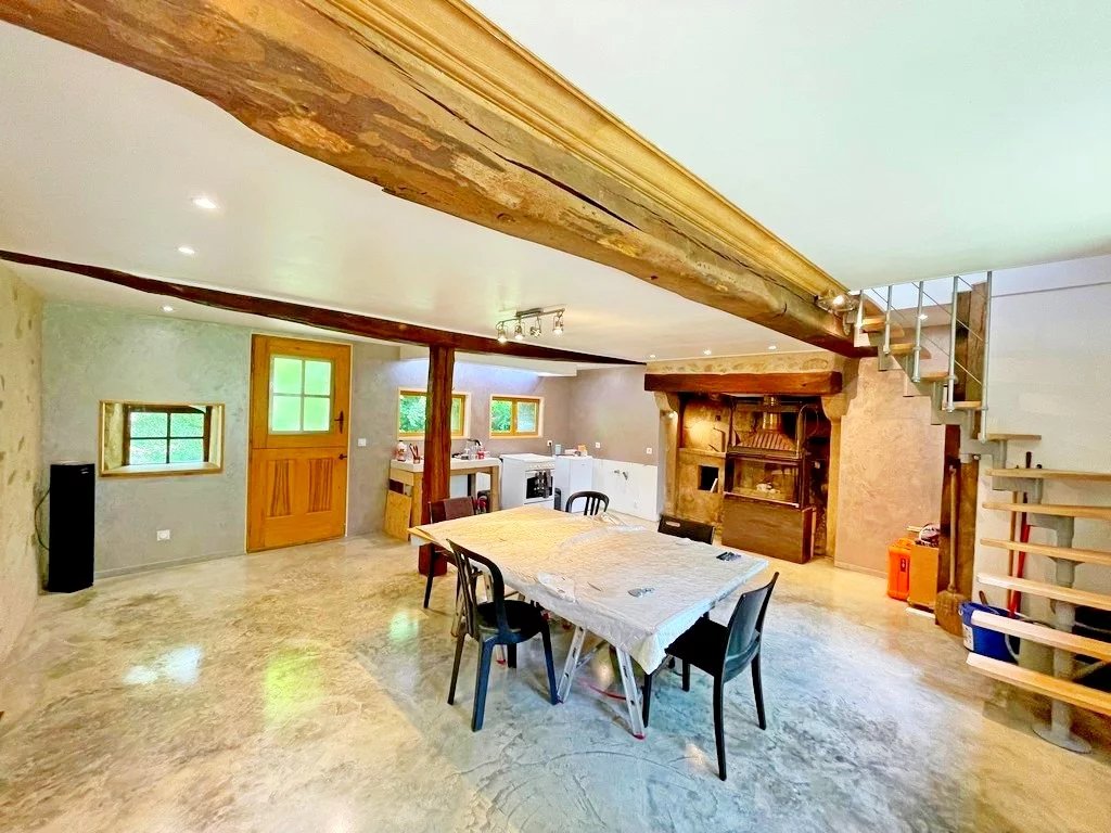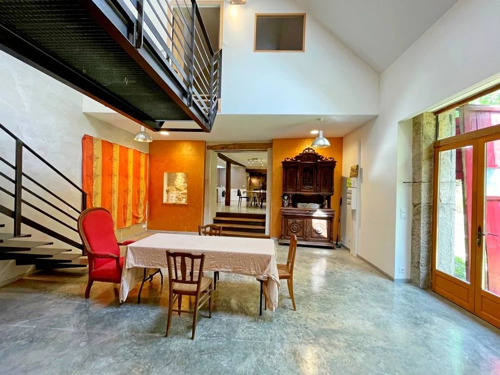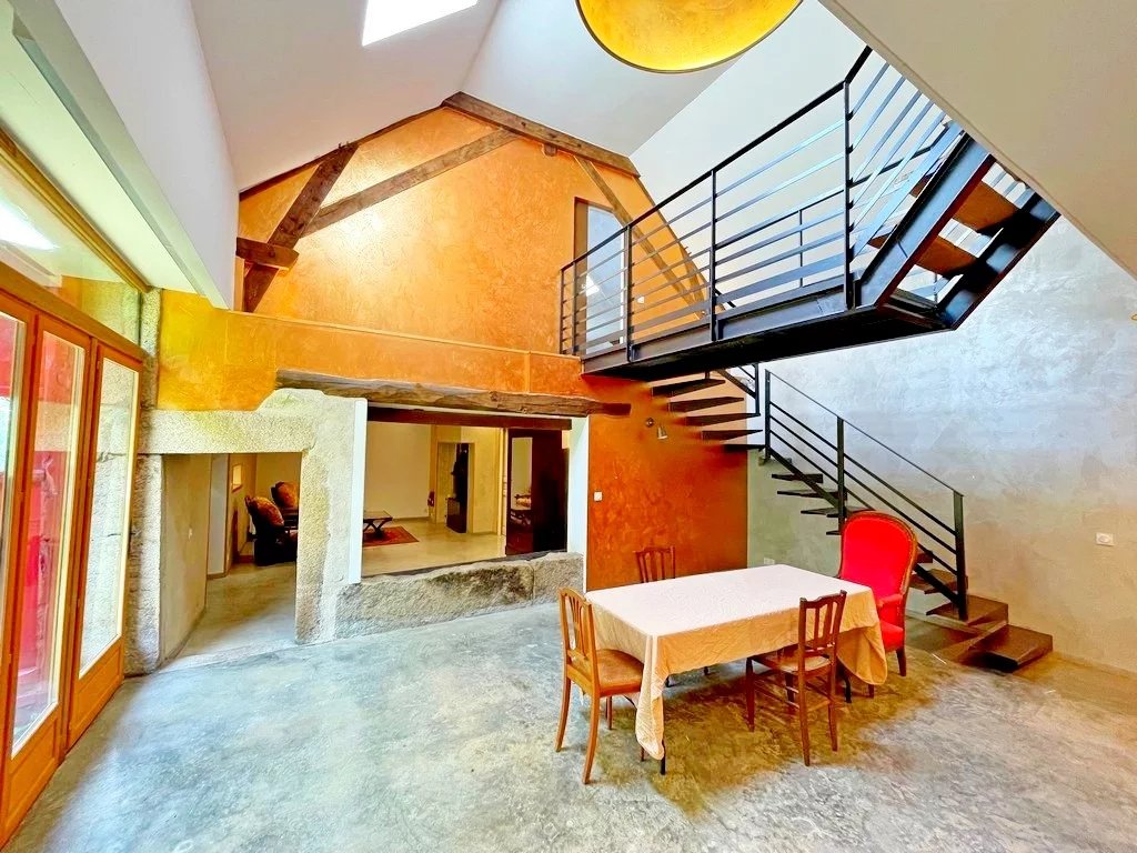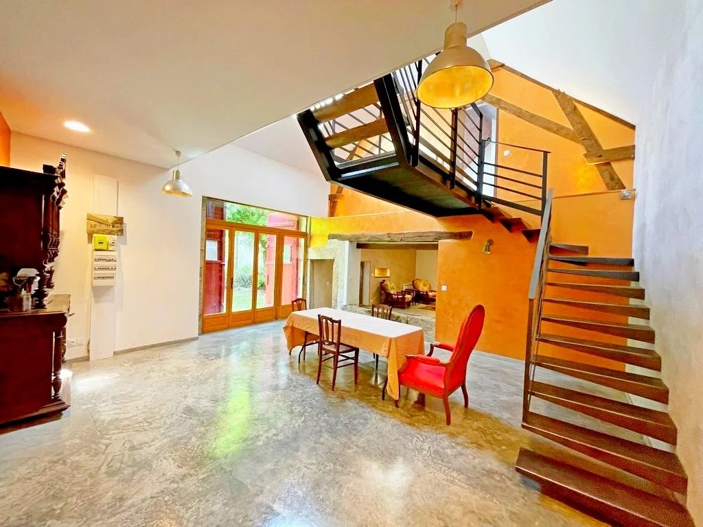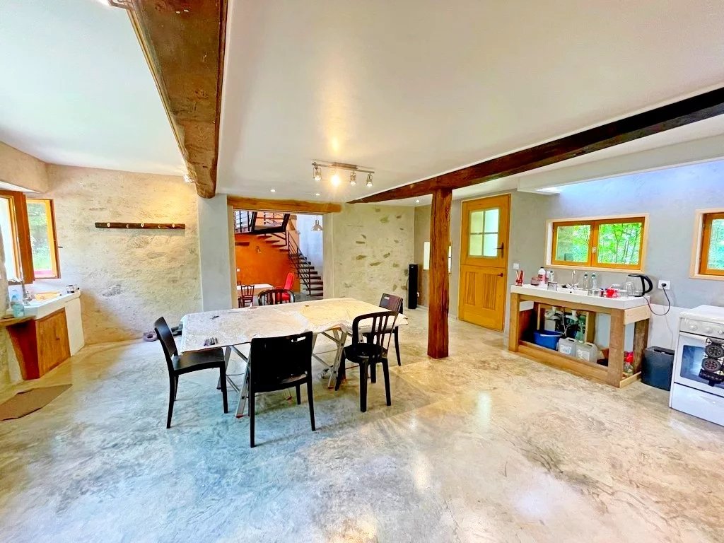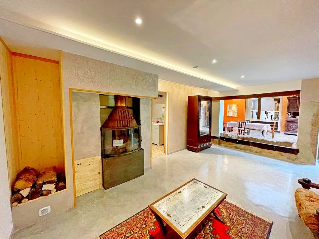 Entrée sur une vaste salle à manger 35 m² env avec coin cuisine (cheminée/insert), grand séjour cathédrale 35 m² env, un salon cosy d'environ 22 m² avec cheminée/insert et salle d'eau/wc avec espace buanderie.