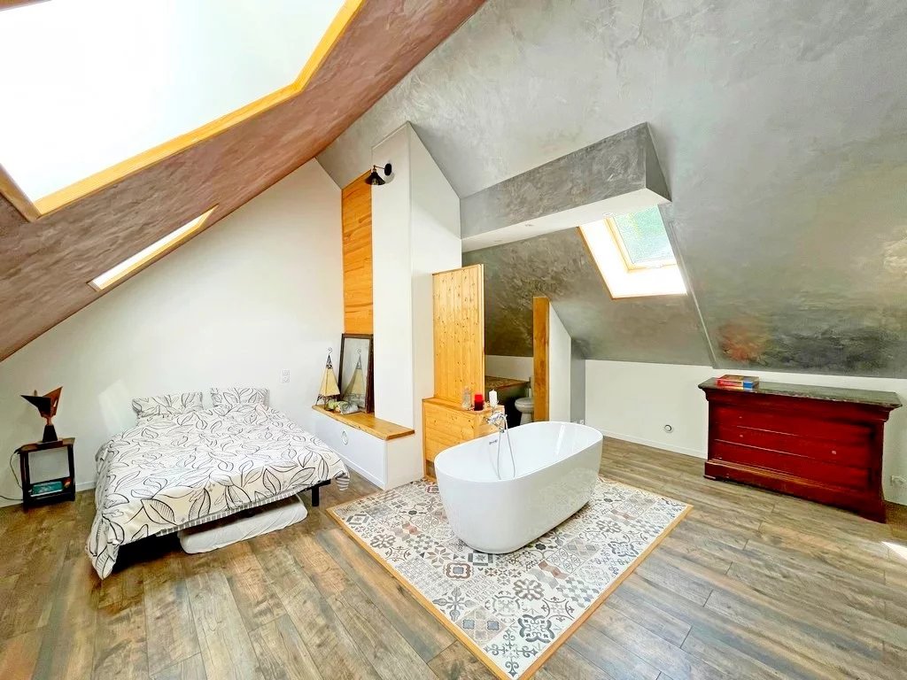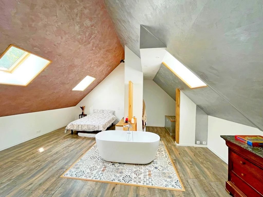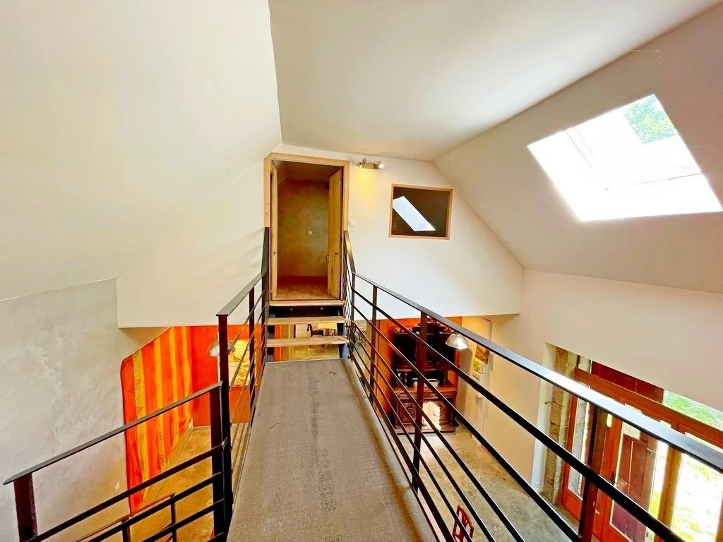 A l'étage et depuis le séjour : une passerelle desservant une suite parentale 20 m² env avec baignoire, lavabo et wc.