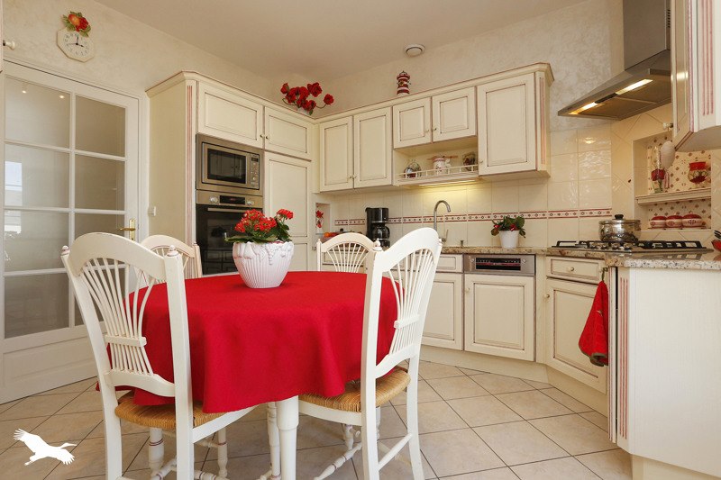 Jolie maison d'architecte idéale pour une famille avec une vie de plain-pied : cuisine aménagée/équipée, bel espace de vie, deux chambres, salle d'eau.