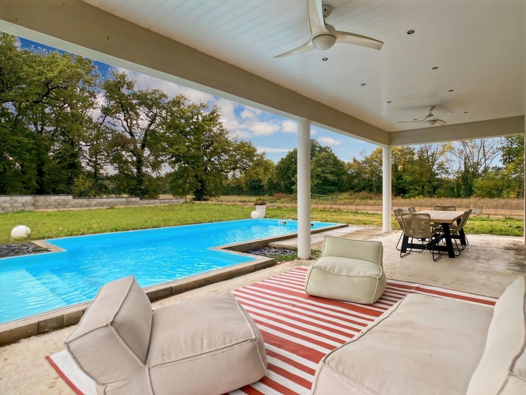 Concernant les extérieurs, vous pourrez profiter d'une grande terrasse couverte accessible depuis la pièce de vie, ainsi que d'une piscine pour les beaux jours. Un pool house avec barbecue est également présent sur la parcelle vous offrant la possibilité d'y aménager facilement une cuisine d'été.