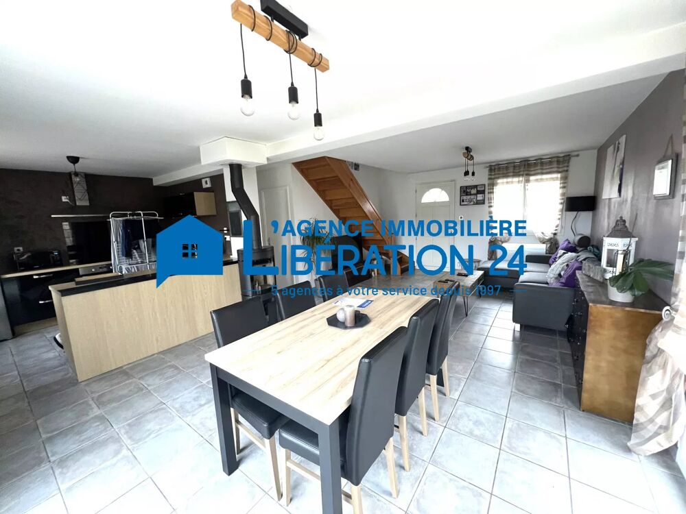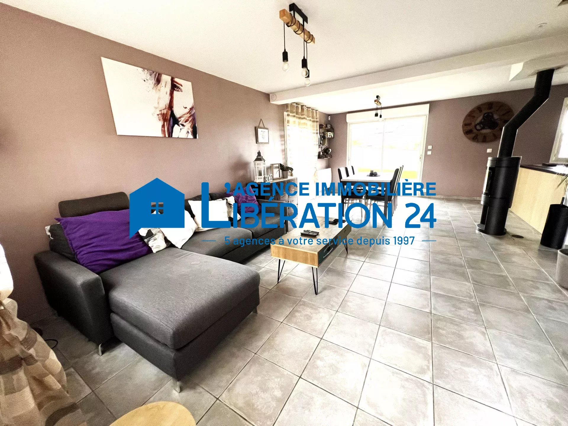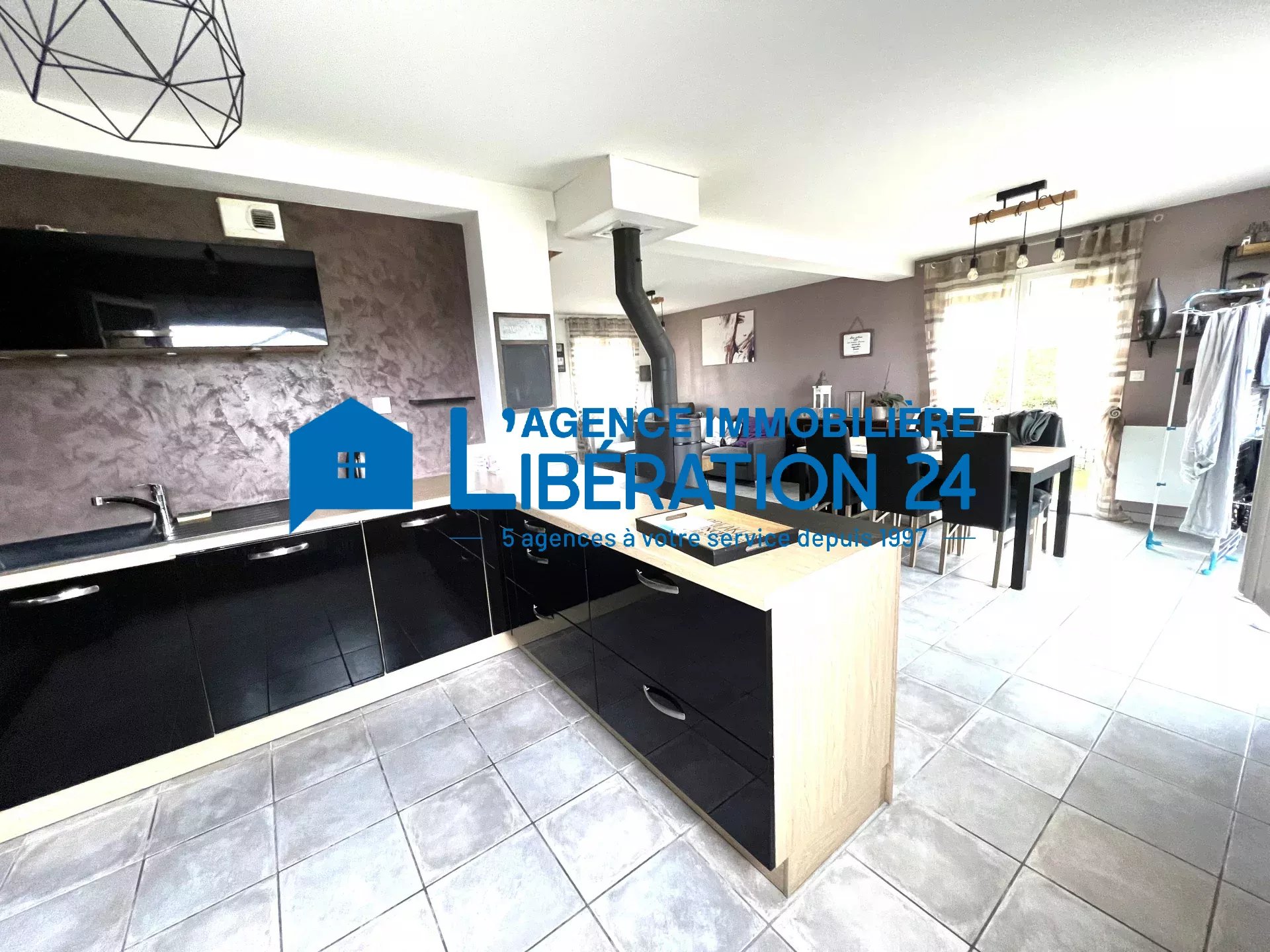 De plain-pied sur les terrasses et terrain, une cuisine équipée/ouverte sur la pièce de vie agrémenté par un poêle à bois.
