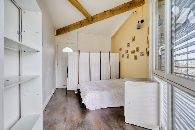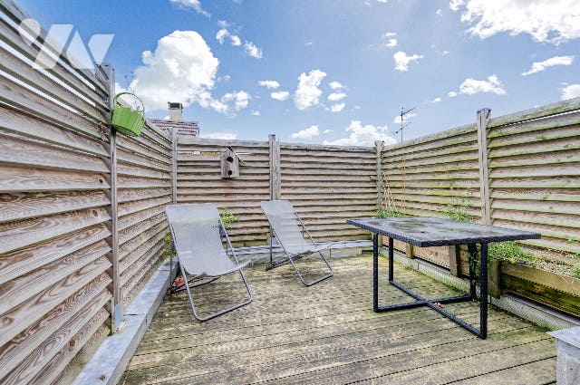 Sur le toit, belle terrasse sans vis-à-vis, aménagée en plancher bois traité autoclave – un véritable extérieur à ciel ouvert.