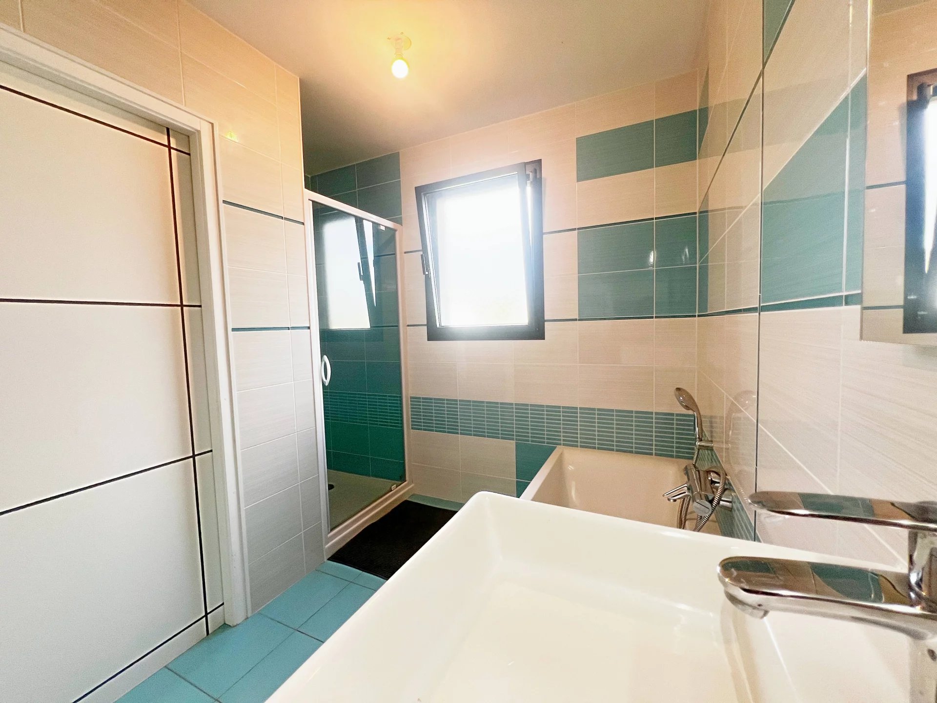 La salle de bains, intégralement faïencée, dispose à la fois d'une baignoire et d'une douche, et les toilettes suspendues, séparées à chaque niveau, témoignent du soin porté aux finitions.