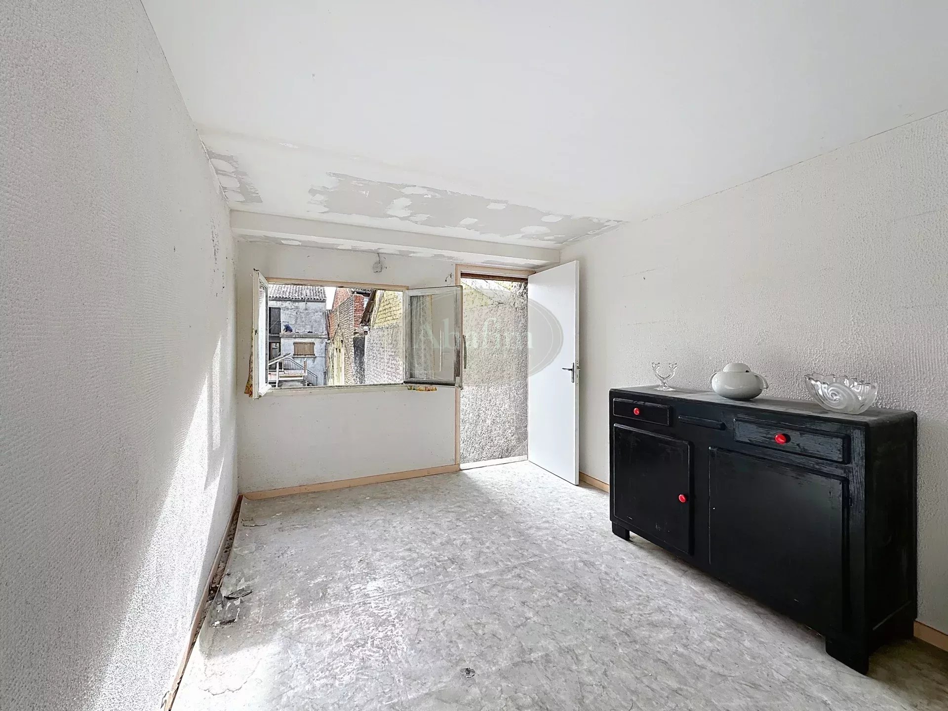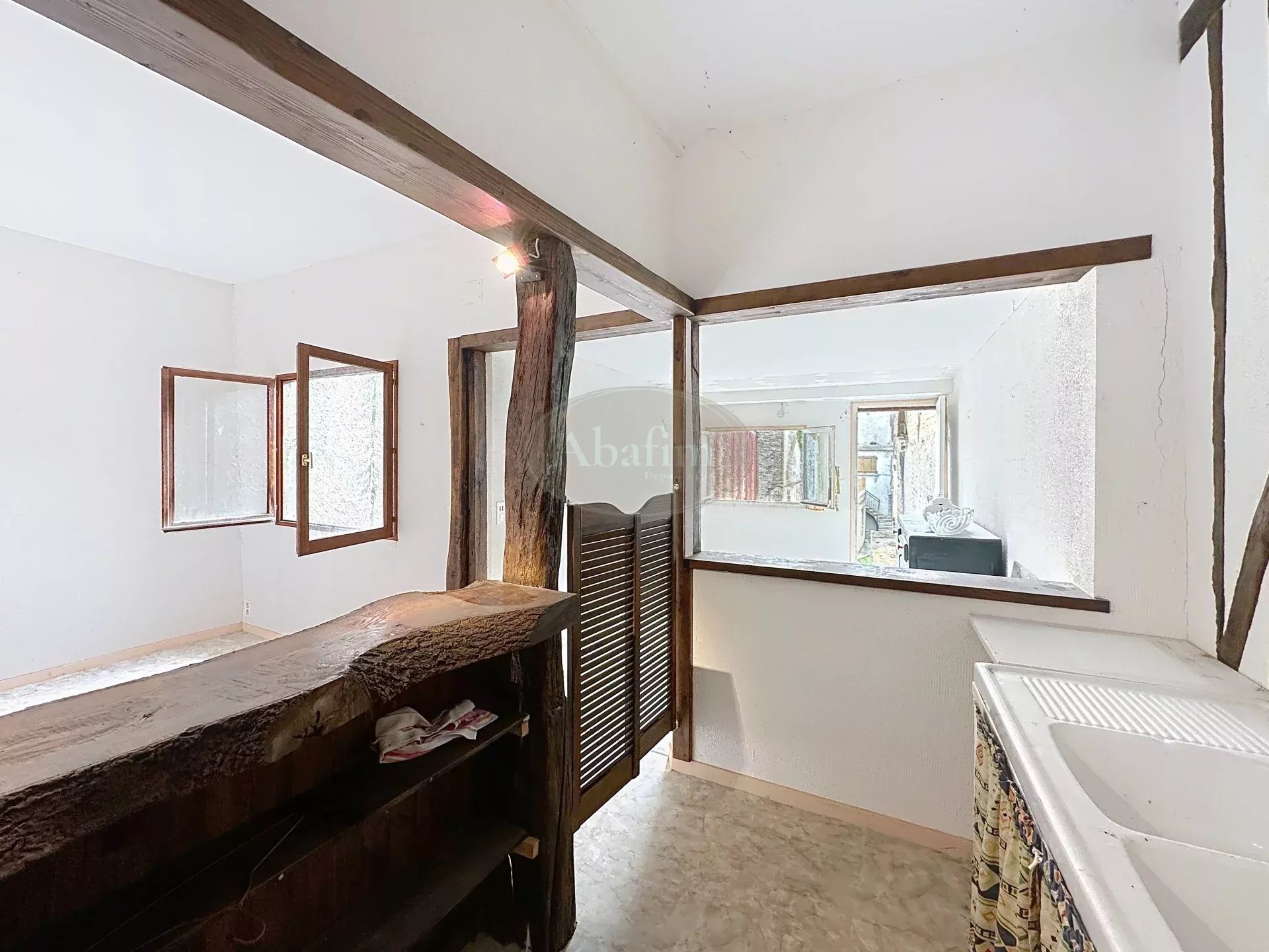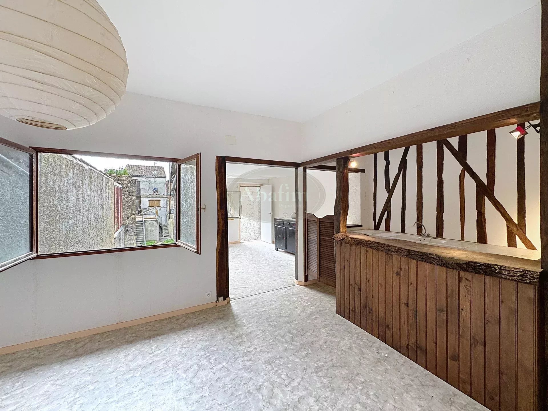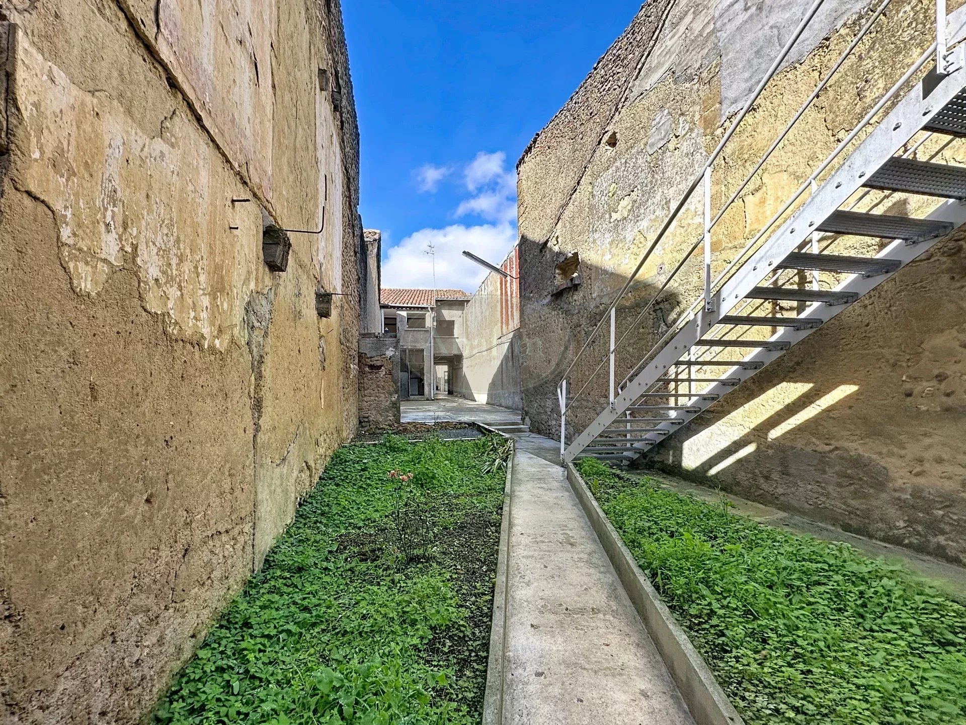 Depuis cette cour, deux escaliers vous permettent d'accéder au premier étage où se trouvent le séjour de 25 m², le salon de 34 m² et une petite cuisine de 7 m².