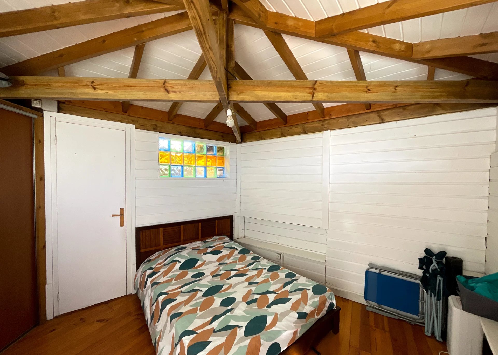 La seconde chambre, aménagée dans un charmant kiosque en bois, séduit par son authenticité : poutres apparentes, ambiance cocooning et charme créole garanti.