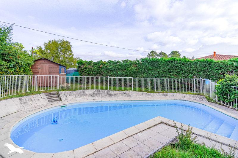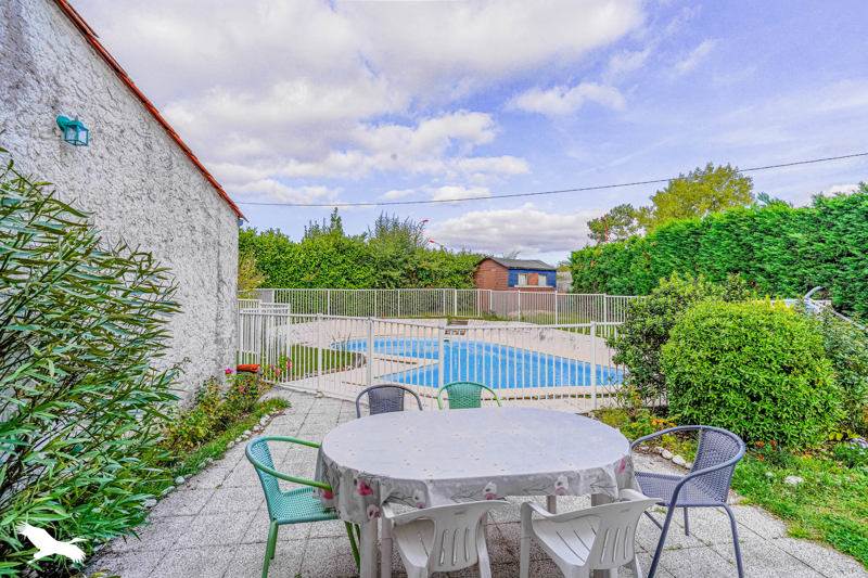 Jardin verdoyant avec piscine, et garage attenant.