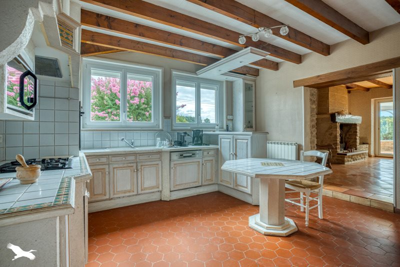 In a quiet environment, house offering kitchen, living room, 5 bedrooms, 2 garages, garden with pool.