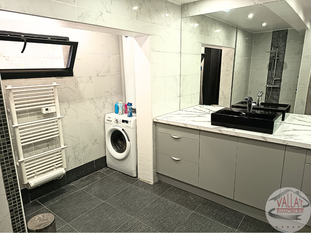 À l'étage, un second séjour de 24 m2 vous accueille, prolongé par un balcon de 7 m2. La cuisine équipée de 11 m2 donne accès à une loggia fermée de 8 m2, offrant un espace cosy en toute saison. Deux chambres de 11 et 11,5 m2, un dressing de 8 m2, une salle d'eau et des WC complètent l'ensemble.