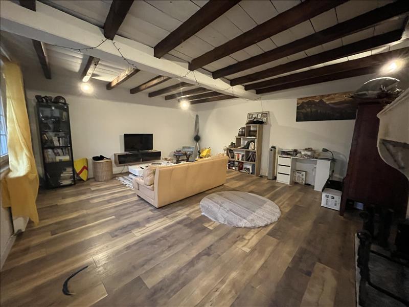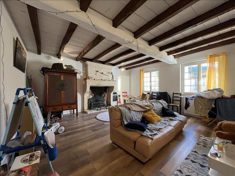 Salon, vaste cuisine salle à manger, cellier.